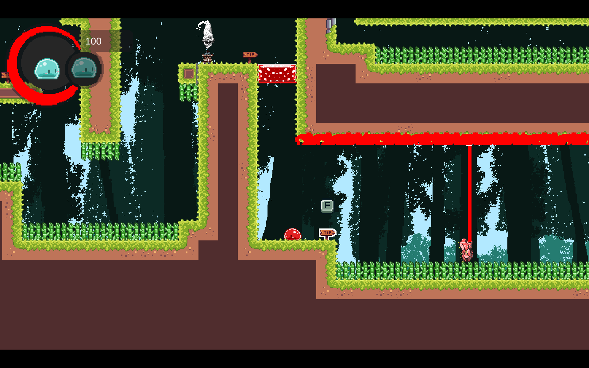중간에 몬스터를 만나 몬스터로 변할 수도 있는데, 이 중에 원거리 공격을 하는 몬스터는 그 공격이 슬라임의 물감과 같이 벽이나 바닥에 물감을 칠할 수 있게 되어있습니다. 처절한 전투 후에 피를 회복하기에 좋습니다.