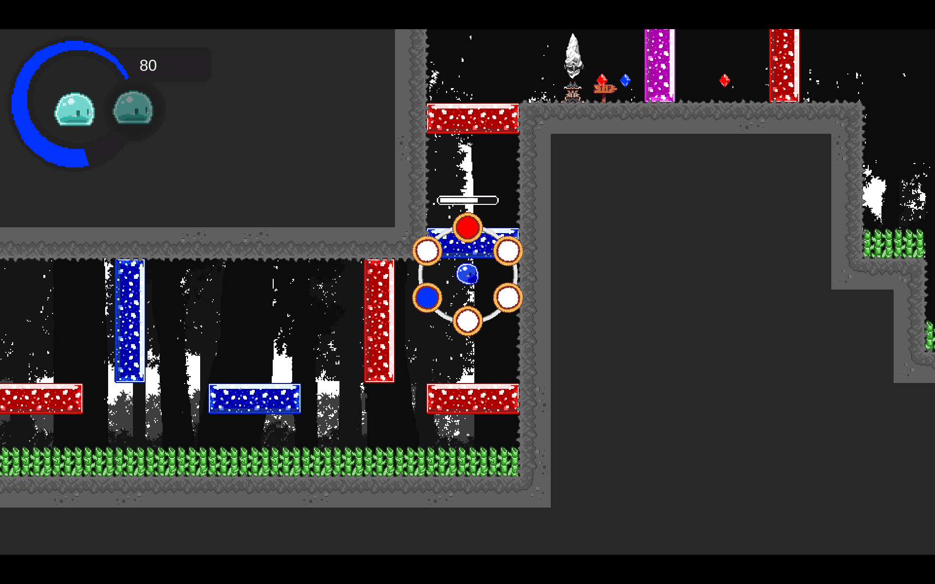 색을 바꾸기 위해서는 팔렛트를 켜야 하는데, 게임 기준 기본 키 Shift를 누르면 팔레트가 펼쳐지고, 일정 시간동안 시간이 느리게 흘러갑니다. 이 사이에 플레이어는 색을 바꾸거나 섞을 수 있고, 또한 조금씩 이동도 가능해서 공중에서 방향을 틀거나 대쉬를 미리 해둘 수도 있습니다. 색으로 이루어진 블록을 바닥으로 활용해 점프해서 건너가야 하는 구간에서는 이렇게 시간을 잠시 느리게 흐르게 하고 색을 바꿔가면서 진행하면 쉽게 건너갈 수 있습니다.