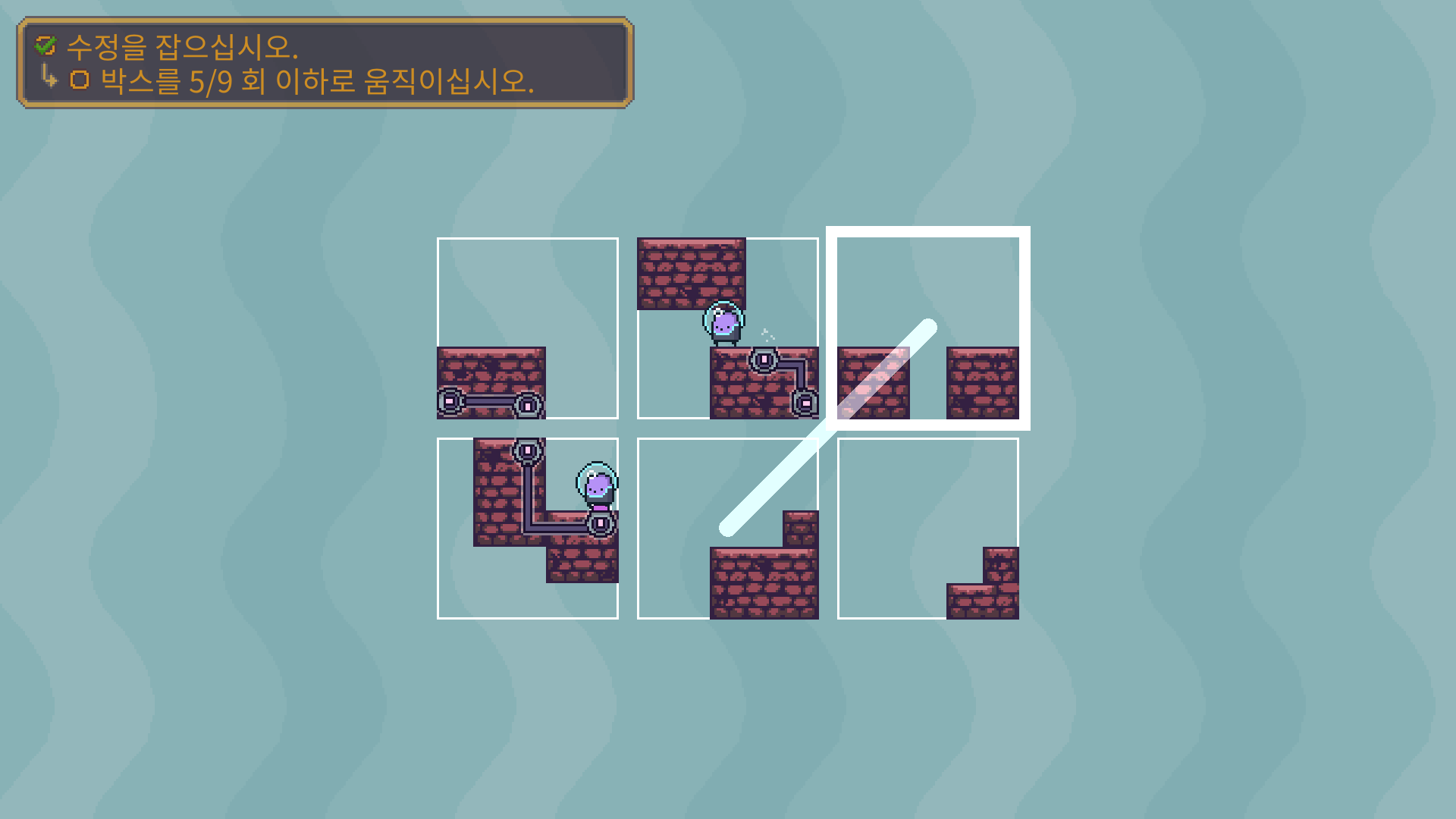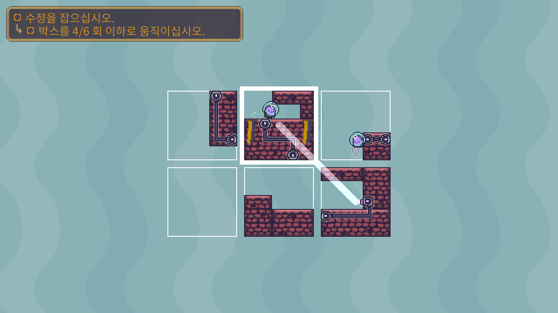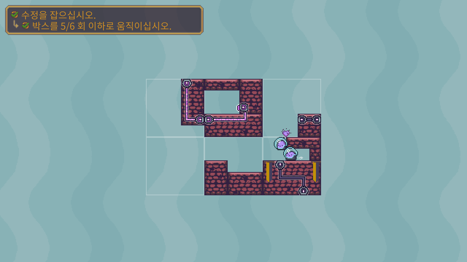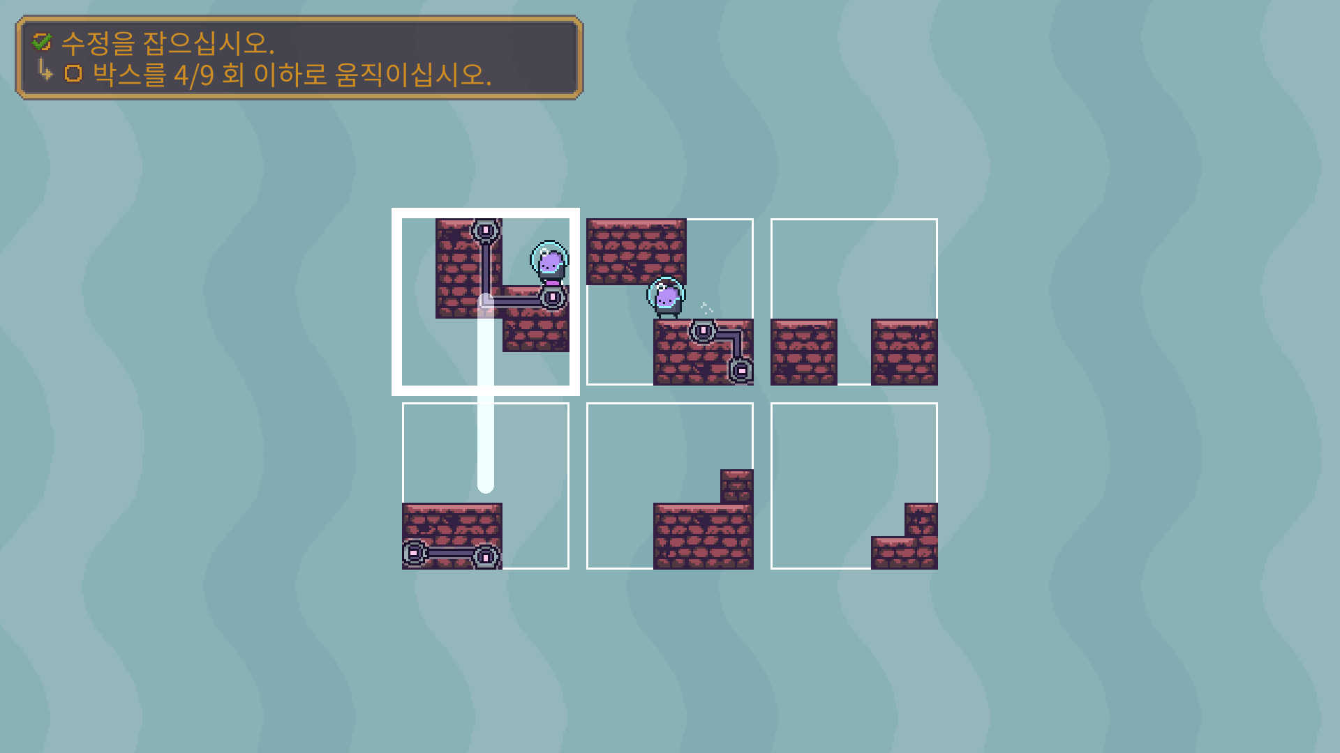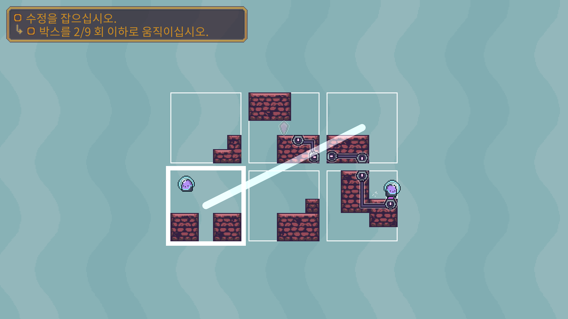 두개의 장애물을 해체 한 다음에 박스를 적절이 바꿔 둘이 만나도록 유도해야 합니다.