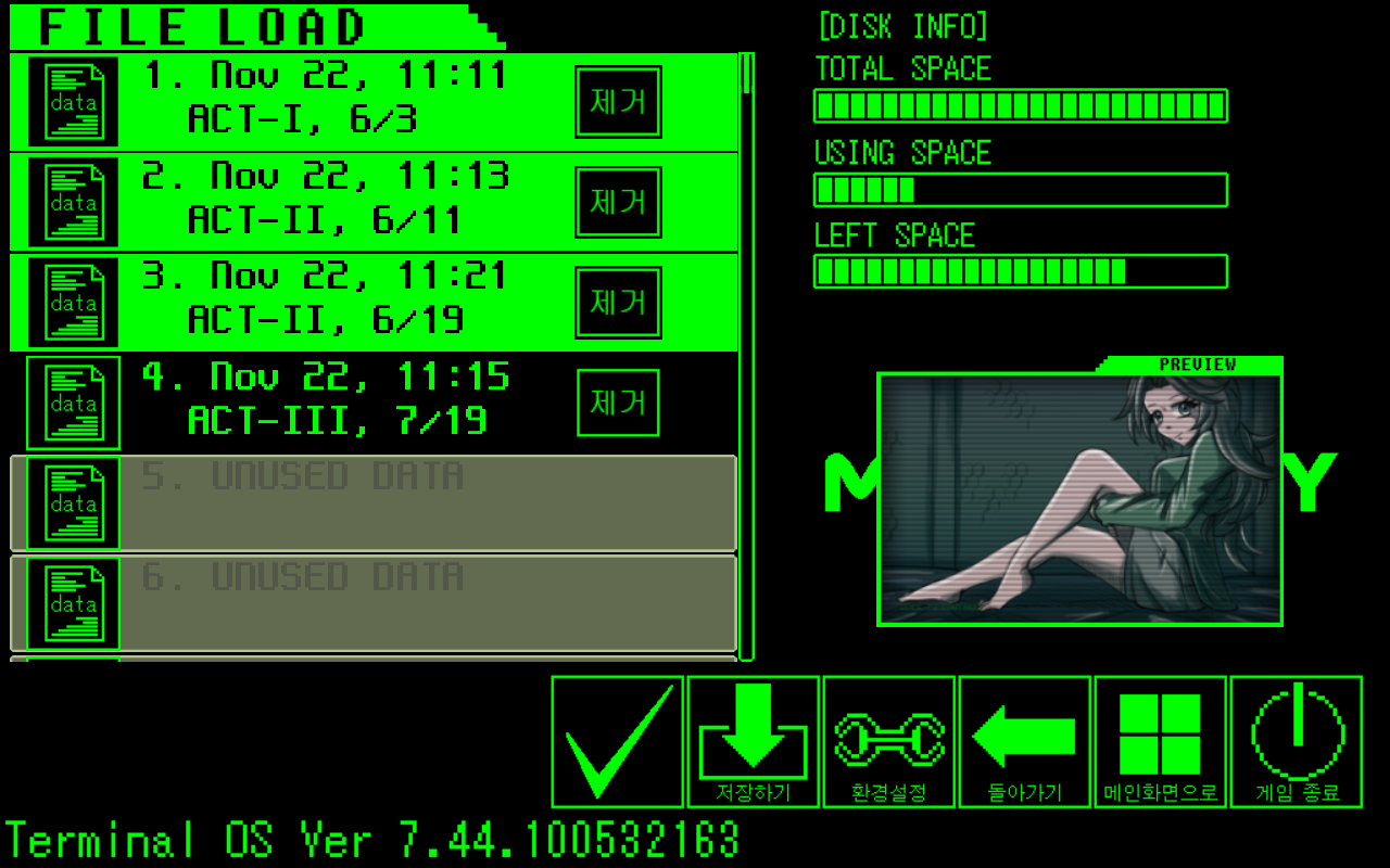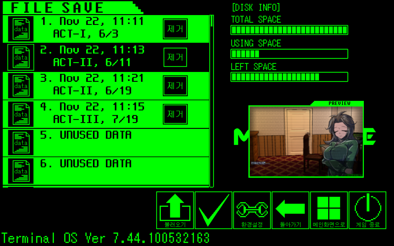 구버전에서 저장된 세이브 파일의 경우 오른쪽에 나오는 썸네일이 이상하게 보일 수 있습니다. 단순히 썸네일 크기 문제이기 때문에 새로 세이브하면 해결됩니다