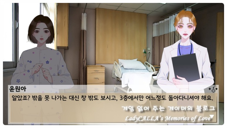 곳곳에 숨어 있는 배드 엔딩들을 다 수집해 보는 것도 좋겠지만 다회차를 좋아하지 않는다면, 퇴원날 볼 수 있는 트루 엔딩과 노말 엔딩 위주로만 진행해 보는 쪽을 추천해 드린다.