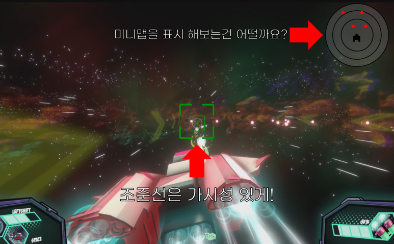 가시성 있는 조준선 UI를 만들어서 조준선 범위안에 적이 있다면 해당 적에게 공격을 하는 방식이라면 좋을 것 같습니다.