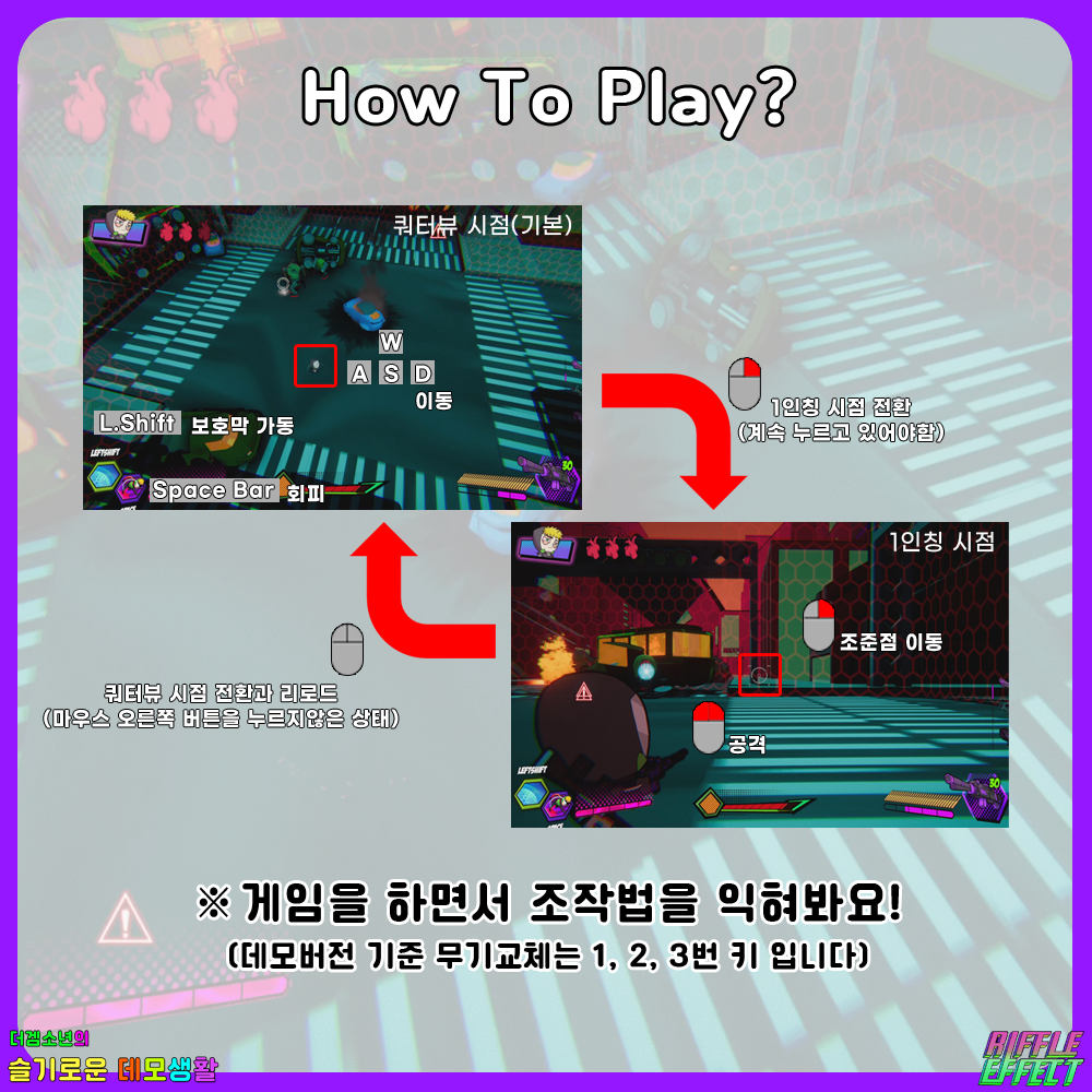 시점변경을 해야하는 이유는 탄 충전을 위해서 또는 적 공격을 회피하기 위해서 1인칭에서 쿼터뷰로 시점변경을 합니다.