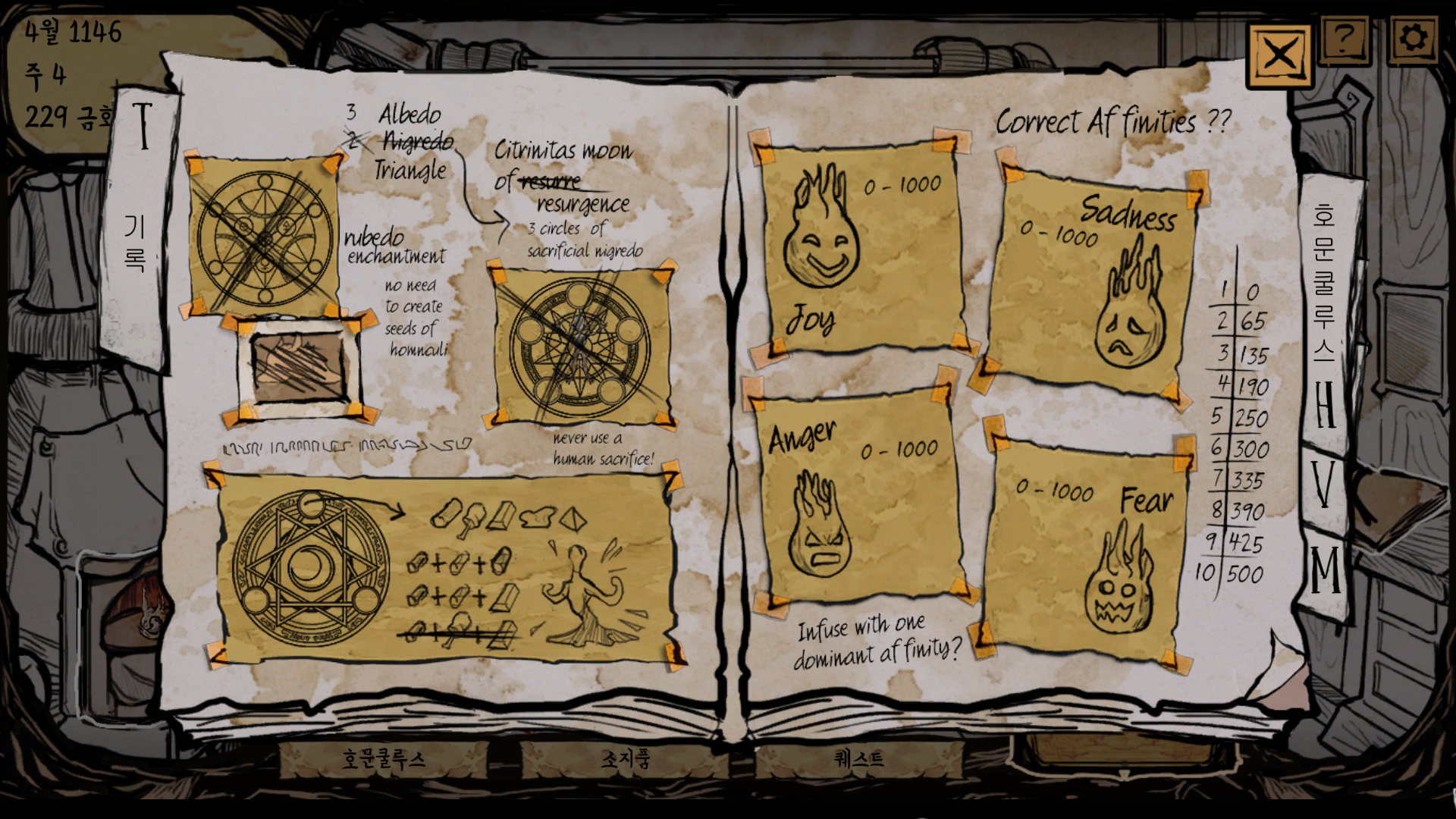 시간이 지나면 딸의 육체가 점점 부패하므로 이를 막기 위한 금화 200개나 받는 ‘향유’를 구입해야 합니다 돈은 어떻게 버는가? 바로 호문쿨루스들에게 일을 시키면 돈을 받습니다. 호문쿨루스에게 노동을 시키면 돈을 벌어 실험에 필요한 자금을 모으는 것은 물론, 작업이 호문쿨루스의 적성과 맞는다면 호문쿨루스의 인간성이 향상되는 효과도 얻을 수 있습니다. 다만 적절한 수준으로 노동을 해야지, 너무 노예 다루듯 일만 시켜 ‘애정’이 전부 없어지면 도망가 버립니다.
