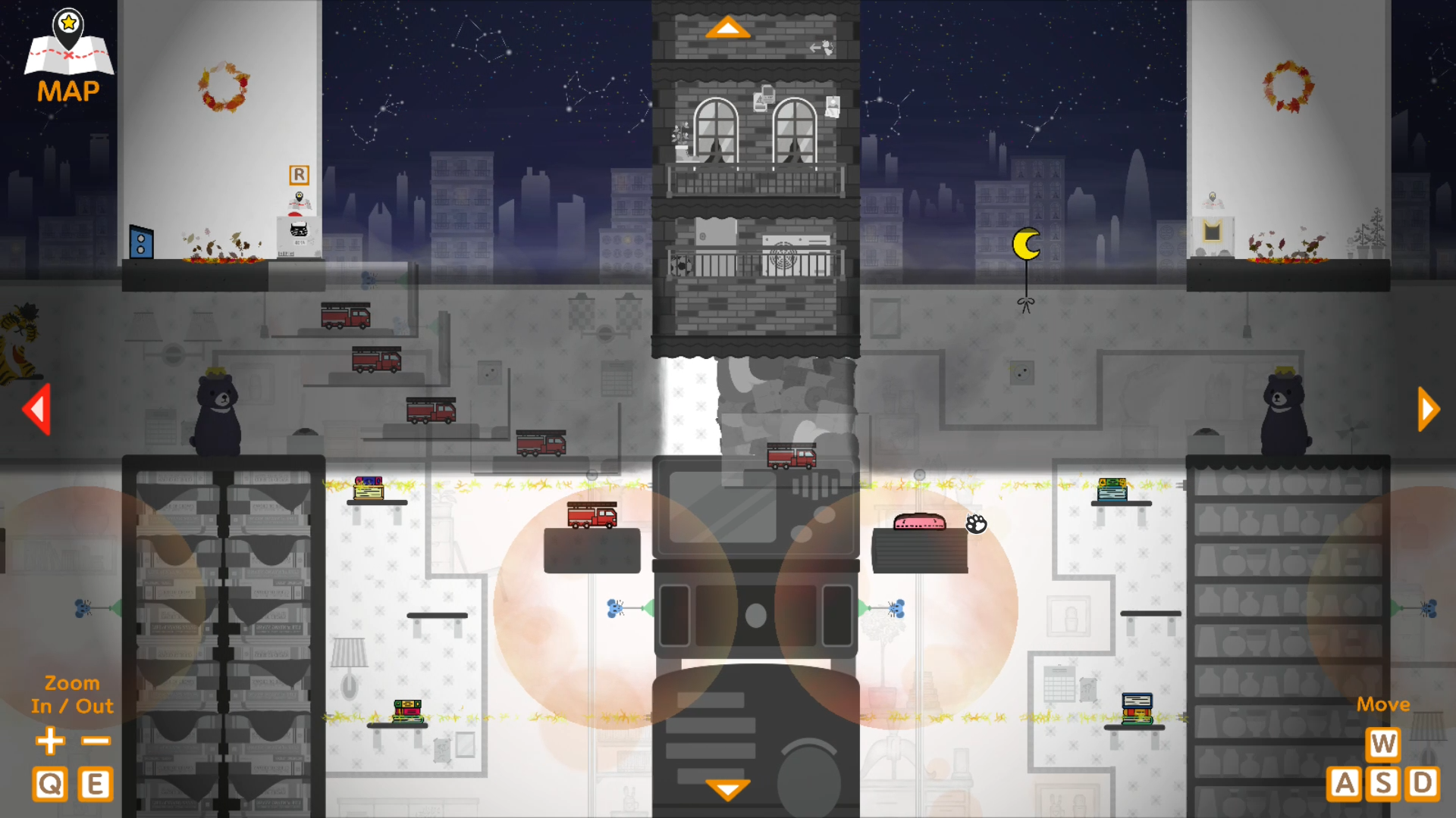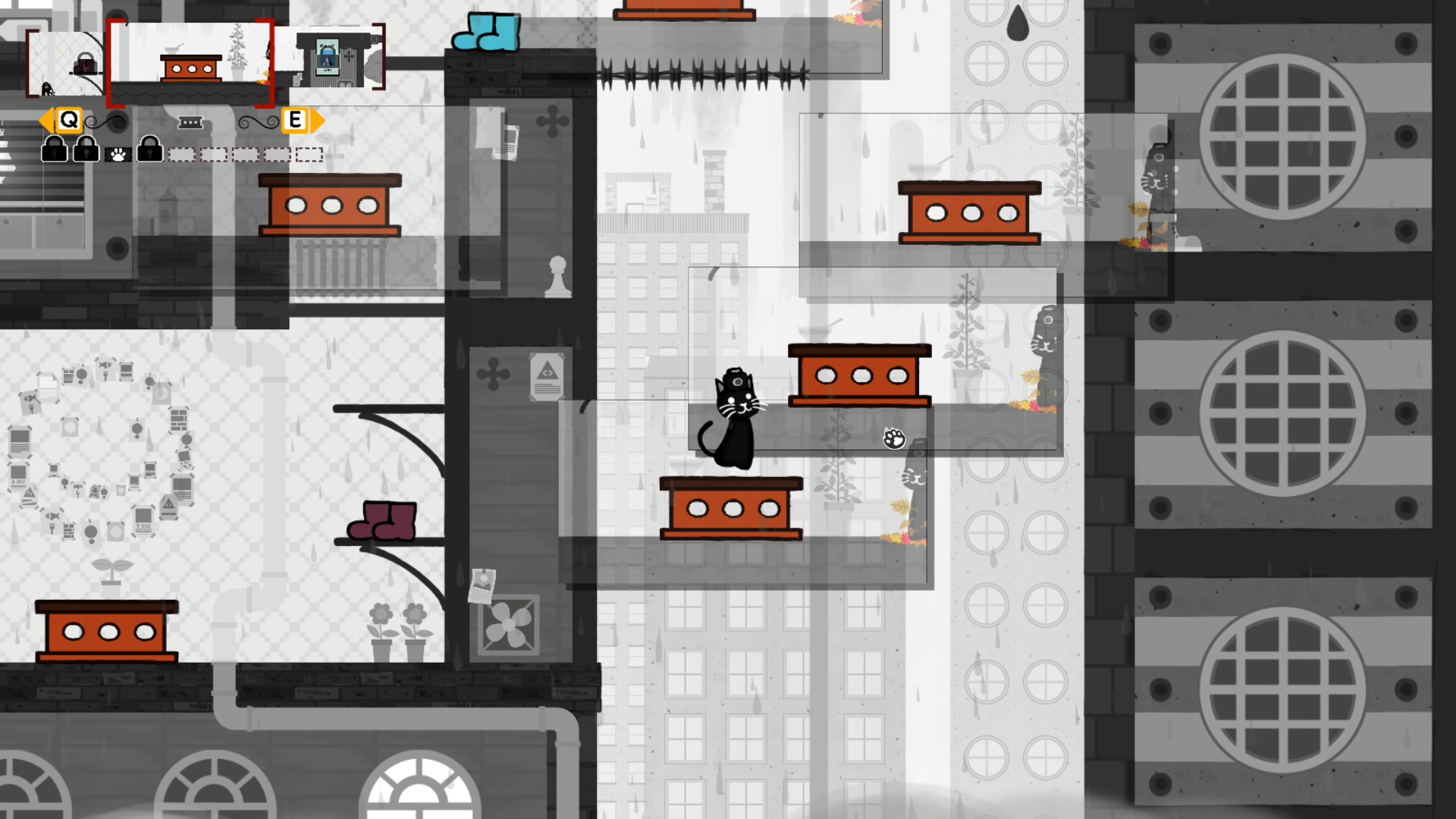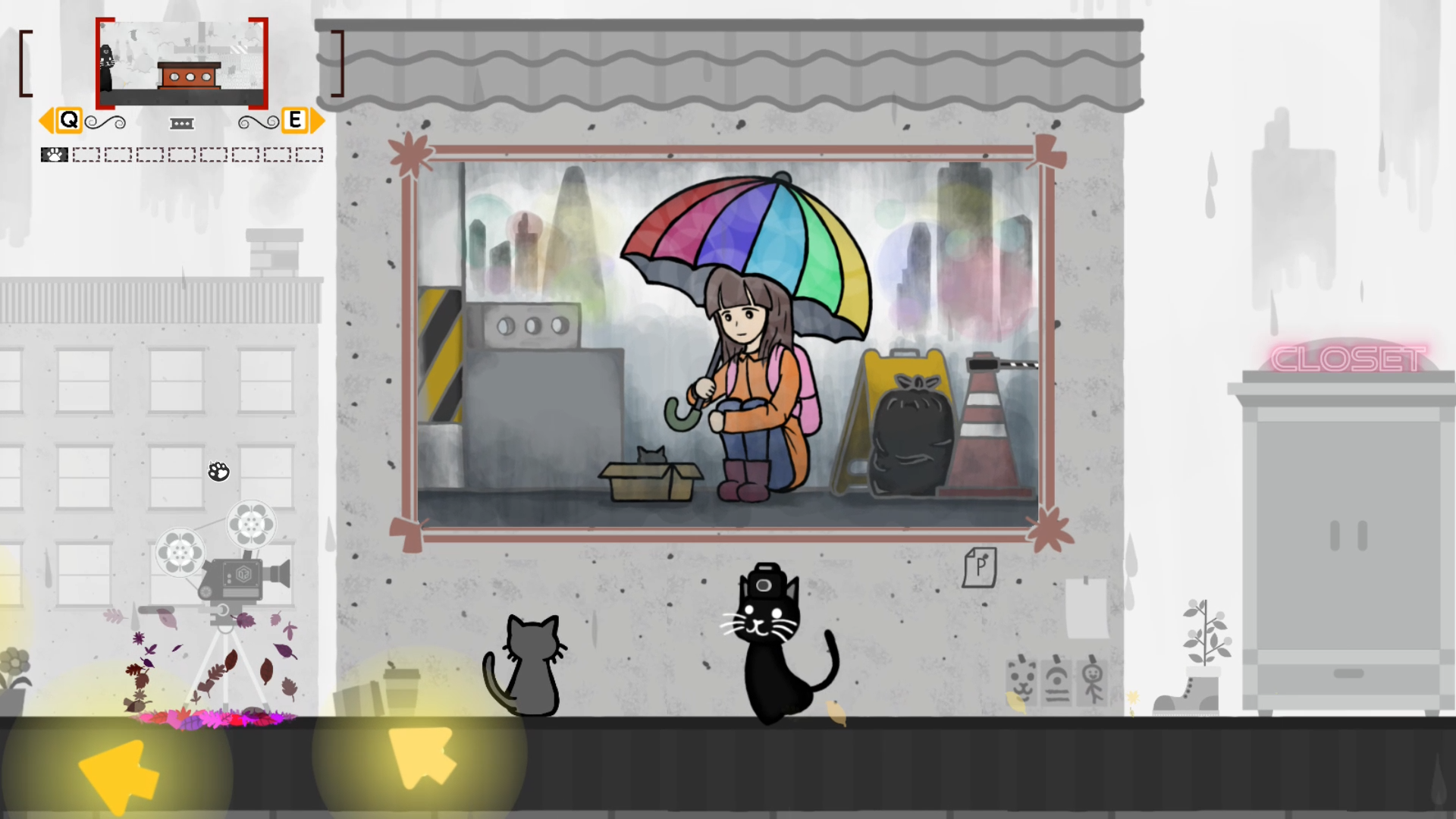 전투가 없는 플랫포머 퍼즐 게임들은 그자체만으로는 밋밋하기 때문에, 적어도 하나씩은 특유의 기믹을 가지고 있습니다. 예를 들면, The Swapper는 클론건으로 클론을 만들어내고 스와퍼로 본체와 클론의 정신을 바꿀 수 있습니다. Closure는 빛이 비추는 곳만 물체가 존재하고, Out of Line은 투창을 이용해 퍼즐을 풀어나가게 되죠. 셔터냥 역시 고유의 특징이 있는데, 바로 "카메라 액션"입니다.