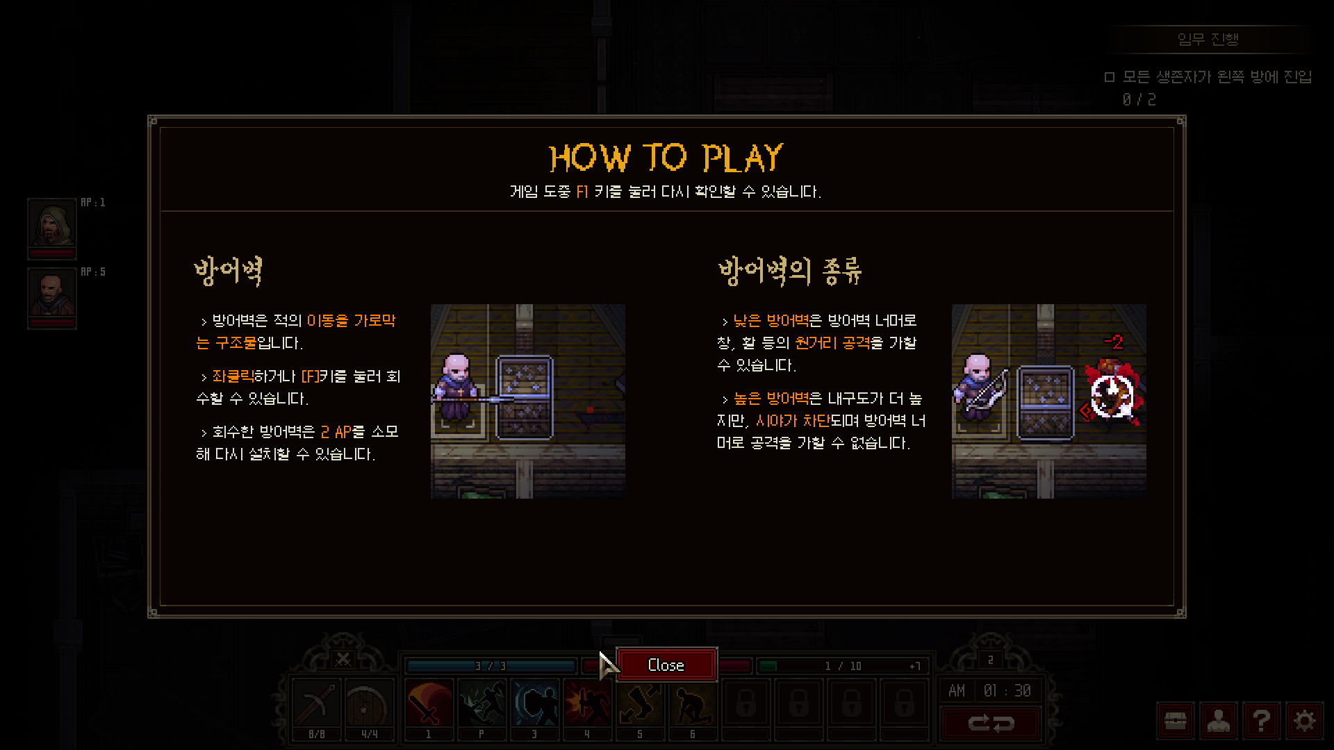 대신 이 게임 최고의 아이템 중 하나인 방어벽은 플레이어블 캐릭터들이 모두 설치와 철거가 가능하며, 적이 달려드는 걸 막아준다. 방벽 자체에도 낮은 체력이 있어 부서지기 쉽지만, 적이 방벽을 치는 데 허무하게 한 턴을 흘려보내면 뒤에 숨어있다가 다음 턴에 목숨을 가져가 주면 된다. 적들이 한 번에 감당하기 힘들 정도로 몰려들거나, 강력한 적과 싸울 때는 먼저 방어벽으로 아군에게 유리한 지형을 만들어둬야 난이도가 그나마 쉬워진다. 시작부터 수도원 중앙에 널려있으니 요령껏 챙겨두면 두고두고 쓸 수 있다.