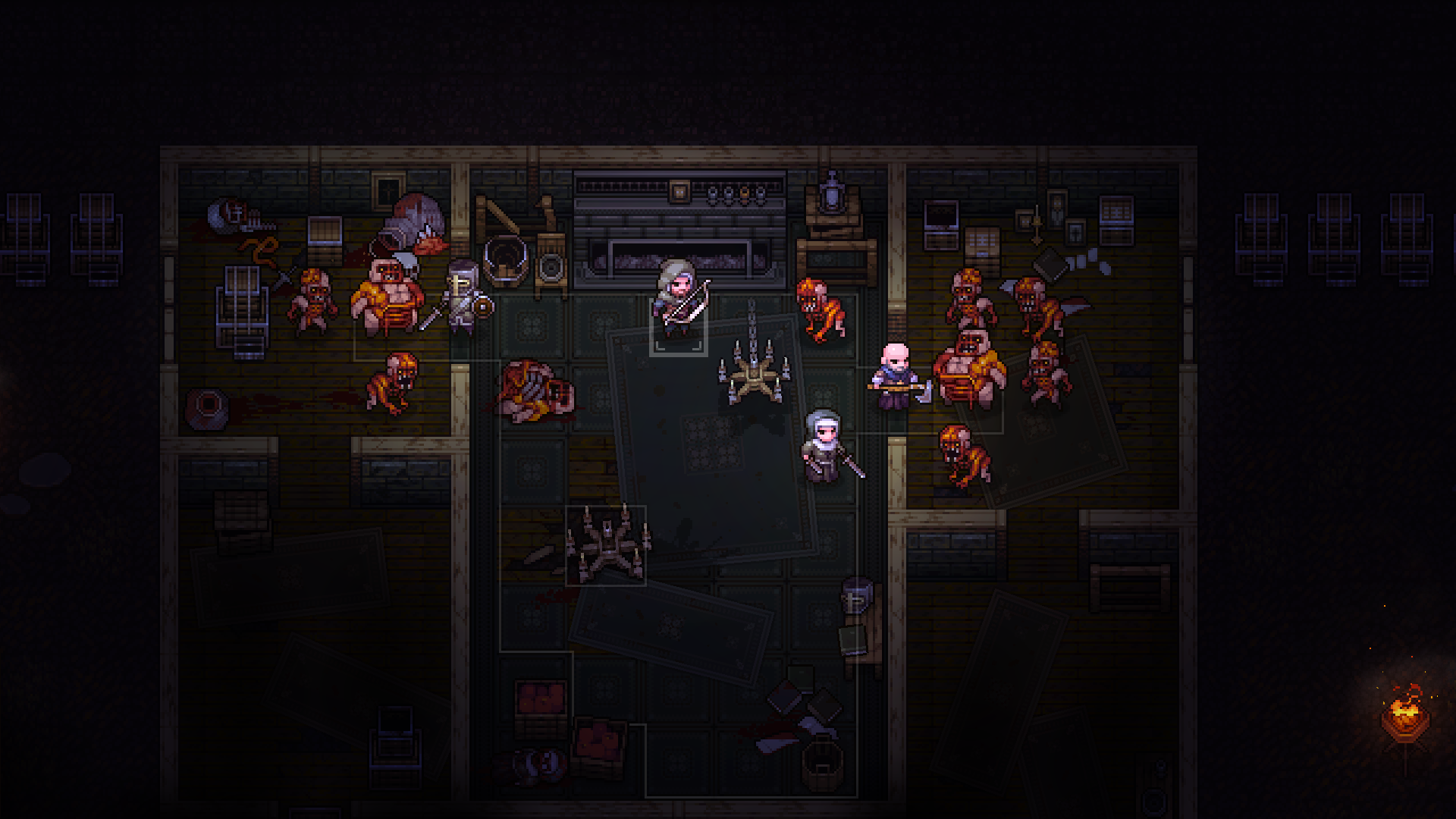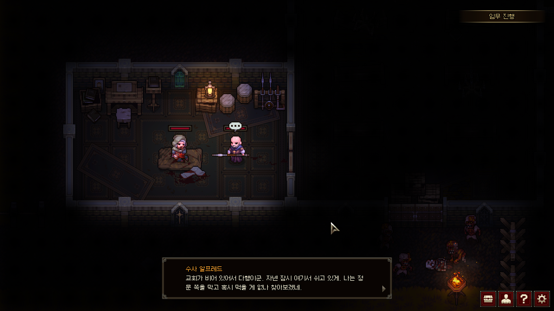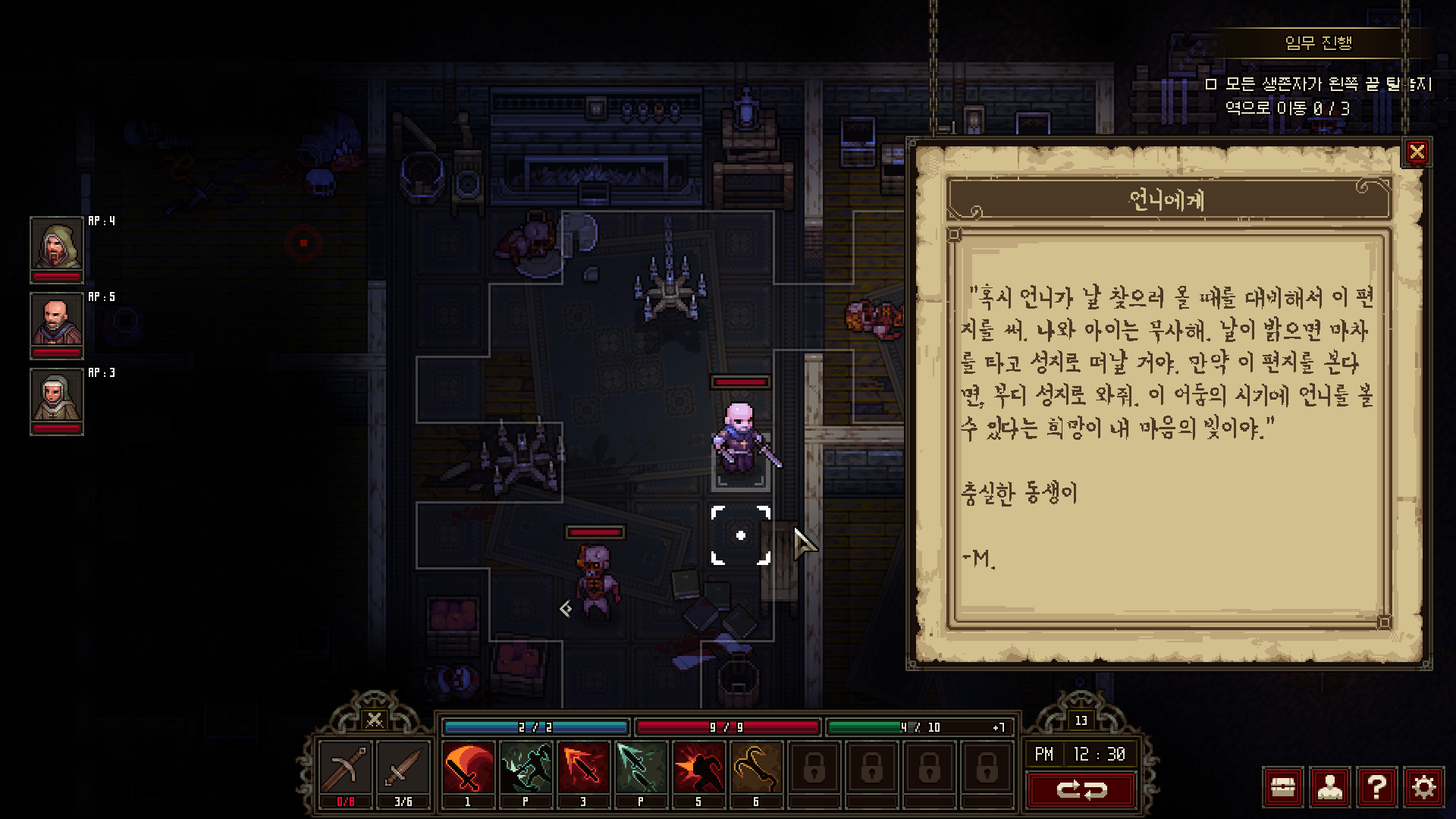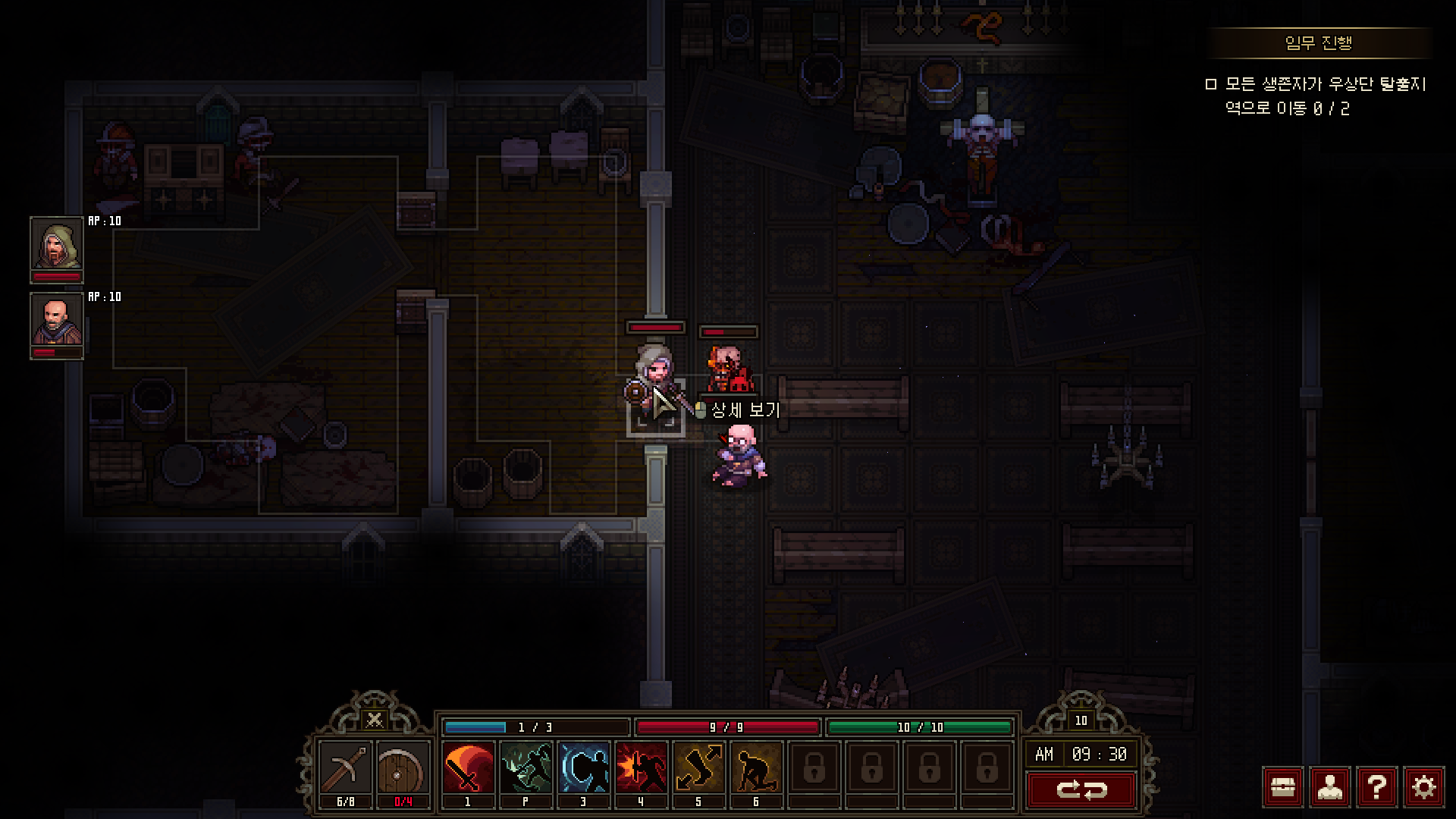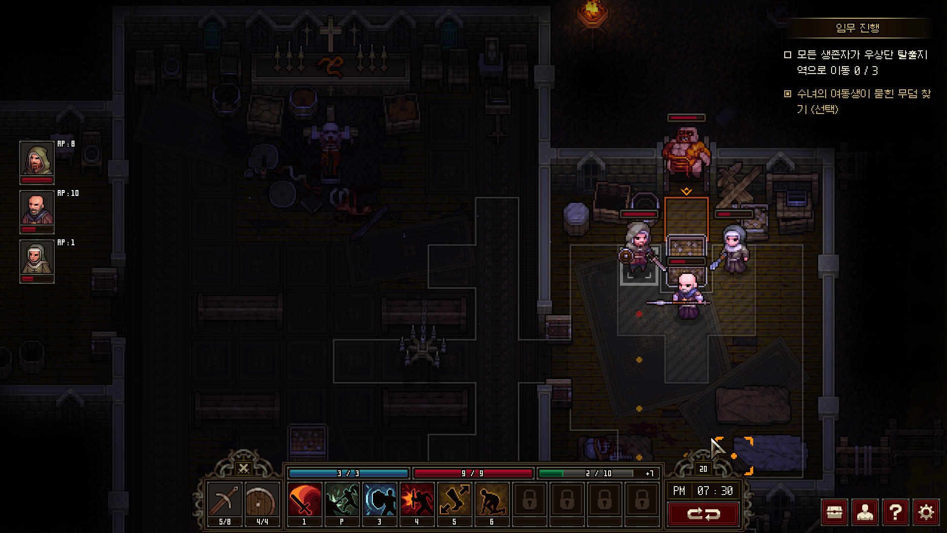 가령 사냥꾼의 경우에는 ‘게걸음’ 스킬을 이용해 적에게 붙잡힌 상황에서도 피해 없이 한 칸 대각선 이동을 할 수 있다. 수사는 밀치기를 이용해 적 하나에게 약한 피해도 주고 밀착한 적을 떼어내는 기술이 있다. 데모 버전에서는 근접전이 빈번하게 발생하는데, 밀치기는 확실히 불리해지는 상황을 뒤집을 힘이 있는 것처럼 보인다. 수녀 역시 시야가 닿지 않는 곳에 있는 적의 기척을 확인하는 스킬이 있어 벽 너머의 상황을 대략적으로 알 수 있다. 어느 캐릭터의 스킬도 놓칠 게 없어서 한 사람이 죽었으면 아예 처음부터 다시 시작하는 게 정신건강에 좋다.
