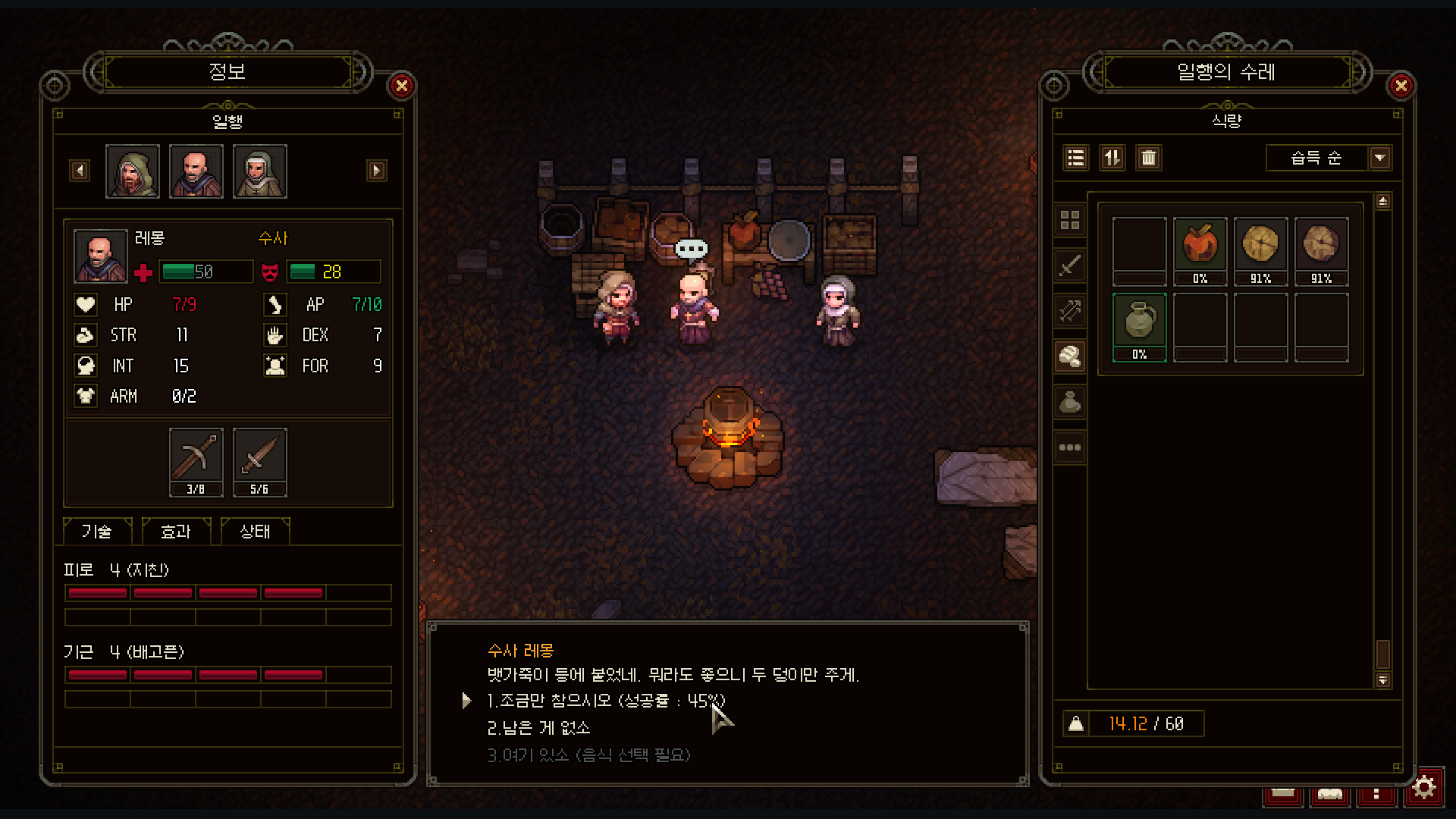 각 장의 핵심 목표를 달성하면 밤이 깊어져서 캐릭터들이 야영을 하게 된다. 탐험을 하면서 모아놓은 식량을 분출해 줘야 하는데, 세상이 대략 망해버린 관계로 멀쩡한 음식을 찾기가 참 힘들다. 음식이 없다면 낮은 확률로 찾을 수 있다는데... 한 번도 성공해 본 적이 없어서 얼마나 효과가 좋은지는 모르겠다. 과정이 어쨌건 인물들에게 만족할 만한 식량을 제공하지 못하면 능력치도 떨어지고, 기분이 상했음을 대화로 알 수 있다. 데모 버전인 지금으로선 인물 간의 갈등이 부각되지 않는데, 정식판에서는 인물 간의 갈등이 게임을 진행하는 데 결정적인 장애물로 작용하지 않을까 하는 예상이 든다.