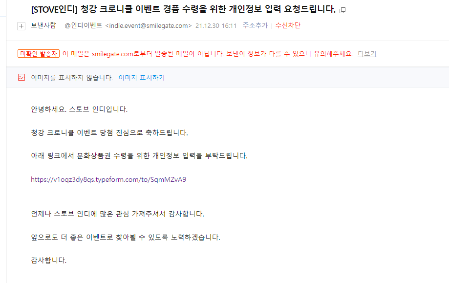 smilegate.com 에서 발송되지 않았다는 경고 문구가 있어 오해하신 것 같네요. 이 부분은 확인 후 개선하도록 하겠습니다. 놀라게 해드려 죄송합니다