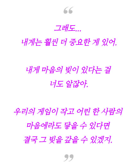 루나는 마음의 빚이 있다며, 그 마음의 빚을 갚아나가기 위해 게임을 개발하는 것이라고 말한다.