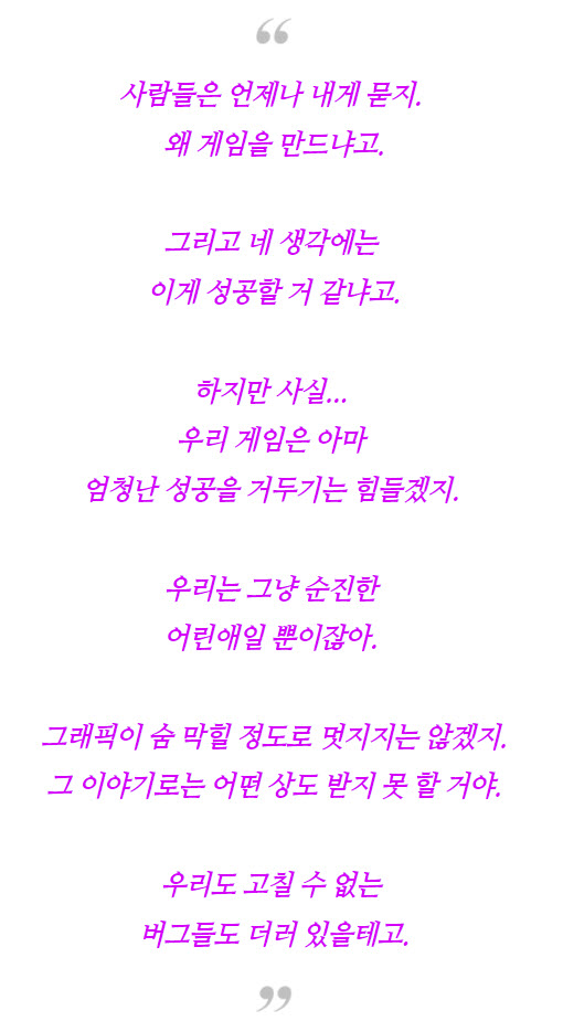 더욱이 그 게임이 인디 게임이라면, 인디 게임이라는 보이지 않는 한계를 깨트리고 소위 말하는 대박의 꿈을 이루기란 여간 어려운 일이 아니다.