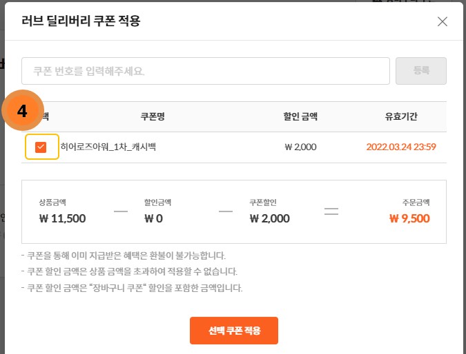 4. 히어로즈 아워 캐시백 선택! 그리고 적용!