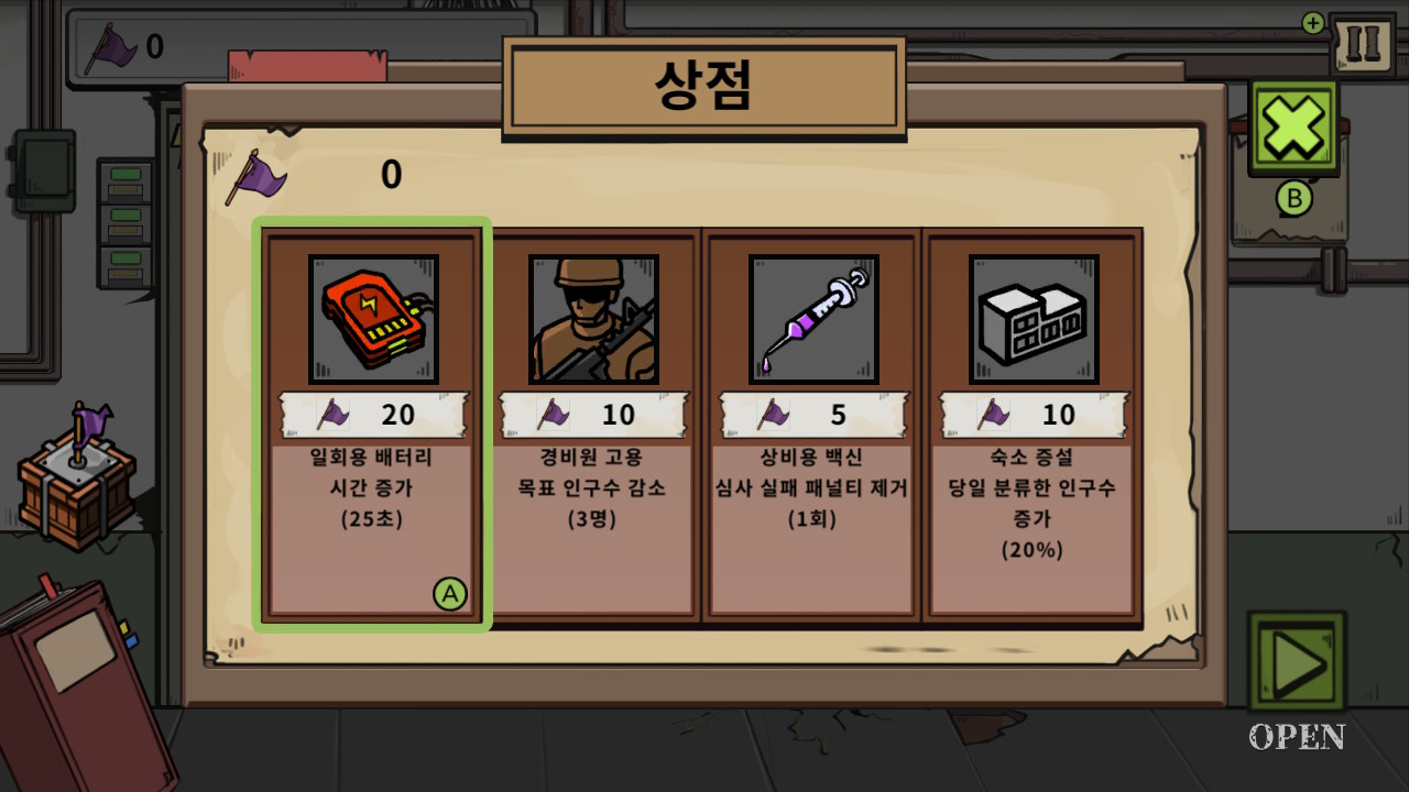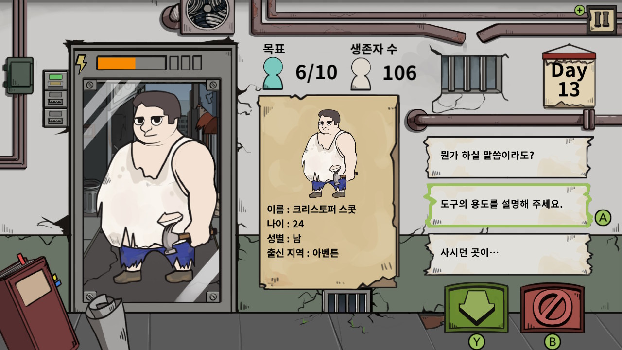 어떤 게임이라도 진행하다 보면 요령이 생기기 마련이고, 나는 후 이즈 좀비를 진행하면서 점차 외형으로 답을 유추하며 질문하지 않고 패스와 아웃을 선택했다. 시간이 짧기 때문에 잔머리가 발달하게 된 결과다. 애매한 쪽은 일찌감치 포기하고 확실한 쪽을 대피소로 들이게 된다. 생존자 수가 쌓이기 때문에 가능한 방법이었다. 이렇다 보니 차라리 시간을 길게 주고 머리를 더 쓰게 하는 형식이 더 낫지 않았을까 생각하게 된다. 닌텐도 스위치로 이식하면서 터치패널로 질문을 선택할 수 있게 해주거나, 잘못된 선택을 했을 경우 진동이 오는 등 디바이스의 특징을 살린 메리트가 없는 것도 아쉽다.