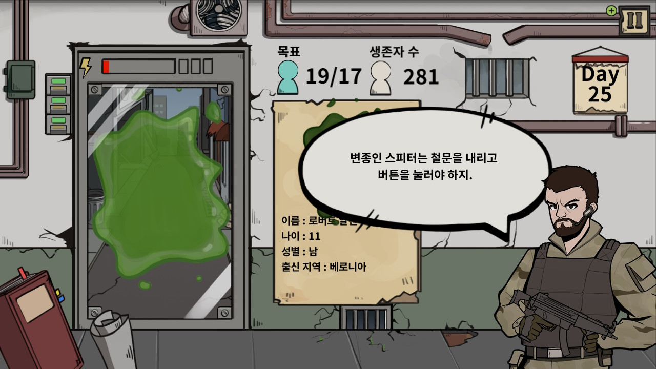 인간과 좀비를 구별하며 대피소에 입장시키는 과정은 초기에 외상을 구분하는 것으로 단순하게 시작하지만, 요일이 지날수록 어떤 지역을 지나왔는지, 어떤 음식을 먹었는지, 몇 세 이하의 어떤 증상을 지닌 사람인지 등의 조건이 매일 추가되었고, 제한이 해제되는 구역도 있기 때문에 항상 플레이어는 신문을 확인하고 외우는 것에 시간을 들여야 한다. 물론 게임 중간에 도감을 다시 확인할 수도 있다. 그러나 도감을 확인하기 위해 스크롤을 내리는 시간조차도 페널티가 되기 때문에 무조건 미리 외워 두어야 한다.