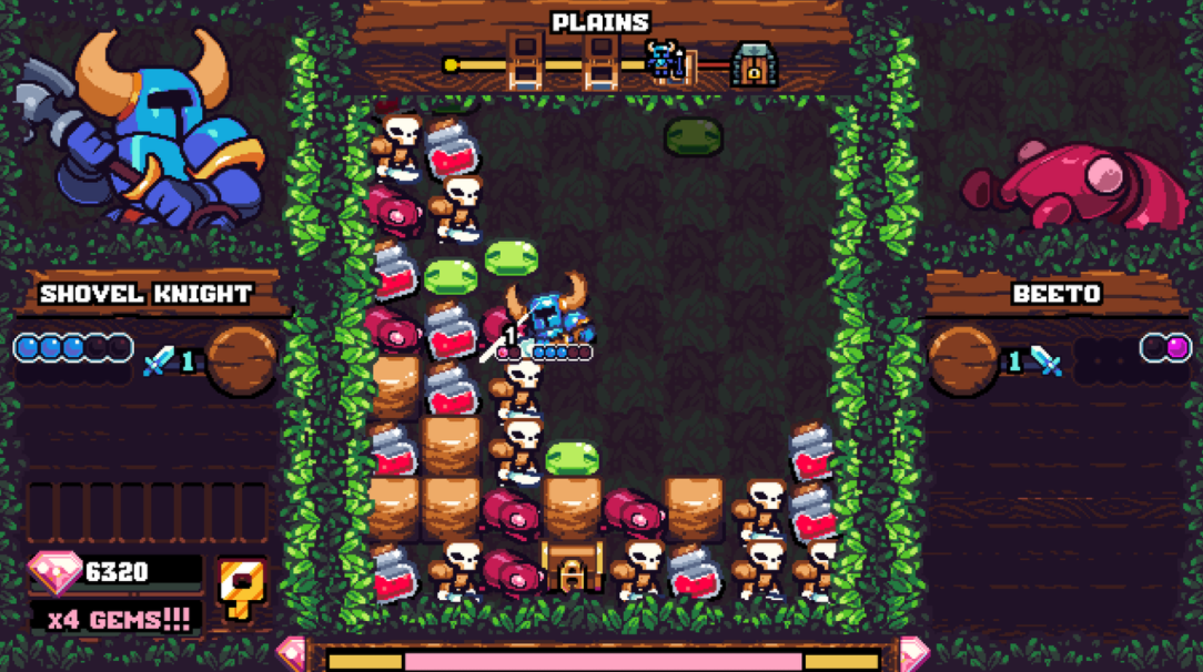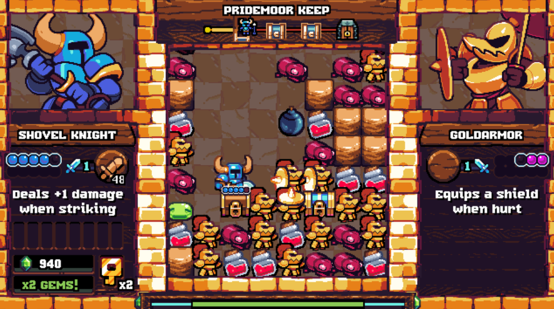 하지만 포켓 던전의 진정한 천재성은 다양한 플레이 가능한 캐릭터에 있다. 새로운 기사를 뽑으면 단순히 외관만 변경되는 것이 아니라, 규칙도 완전히 바꿀 수 있다. 예를 들어 Specter Knight는 물약을 맞혔을 때 피해를 입히고 적을 물리쳐야 체력을 회복할 수 있다. Proplemer Knight는 혼자 있는 적을 상대할 때는 믿을 수 없을 정도로 훌륭하지만 체인을 노릴 때에는 큰 패널티를 받는다. 그리고 내가 가장 좋아하는 Black Knight는 적은 3개의 HP로 시작하지만 놀라운 힘을 가지고 있는데, 이 캐릭터는 그의 보석 게이지를 추가 공격력으로 바꿀 수 있는 특수 능력이 있다. Black Knight로 보석 게이지를 x2 또는 x3까지 올릴 수 있다면 단 한 번의 타격으로 대부분의 적을 죽일 수 있게 되지만, 단점은 포션을 사용하는 순간 버프를 잃고 원래의 공격력으로 돌아간다는 점이다. 나는 이런 위험성이 높고, 보상이 높고, 페이스가 빠른 플레이를 좋아한다.