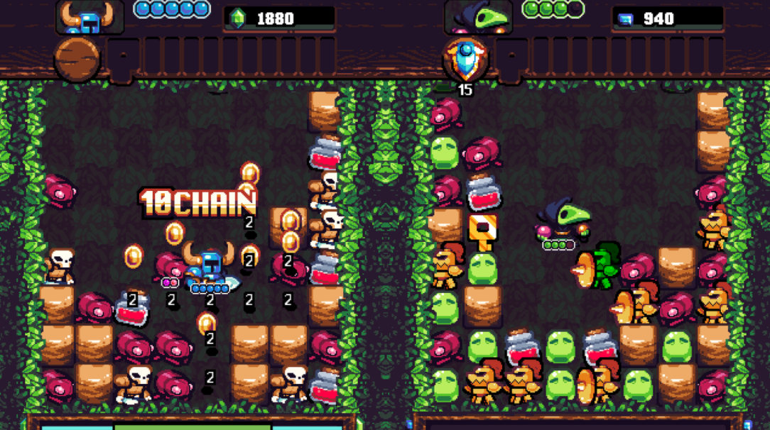 게임이 조금 더 퍼즐 게임 같아지는 것은 같은 타입의 다른 종류의 적을 공격할 때다. 타격만으로 피해를 입힐 수 있지만, 체인 전체에 피해를 입힐 수 있기 때문에 몇 번의 타격으로 전체 열과 열을 제거할 수 있다. 각각의 적으로부터 많은 공격을 받을 수 있기 때문에 대규모 그룹을 한꺼번에 제거할 수 있는 기회를 찾는 것이 가장 중요하다. 다행히 체력이 닳기 시작하면, 체력 두 칸을 한 번에 회복할 수 있는 생명 회복 물약도 등장한다.
