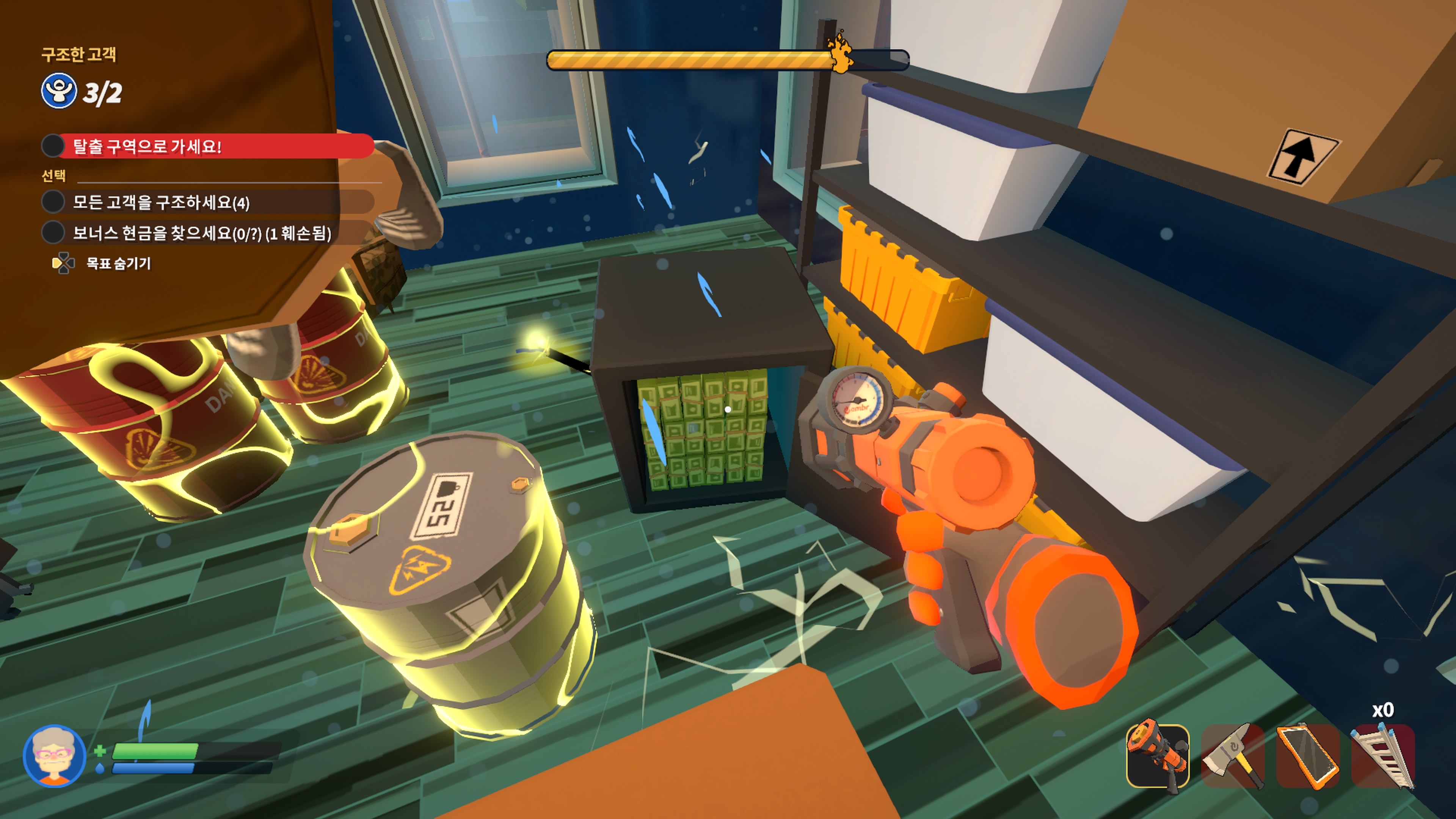 게임에서 무엇보다도 중요한 것은 화재현장에 고립되어 있는 고객들을 무사하게 구출하는 것. 스테이지마다 반드시 구출해야만 하는 최소 인원수가 정해져 있으므로, 빠르게 한 명씩 구출해서 지정된 안전 장소로 옮겨야 한다. 시간이 지날수록 화재로 인해 건물이 서서히 무너지기 때문에, 될 수 있으면 가장 위험한 곳에 있는 고객들을 먼저 구출하는 것을 최우선 목표로 삼자. 플레이어가 가지고 있는 아이템 중, ‘고객 위치 추적기’를 사용하면 구조해야 할 고객이 어디에 있는지를 쉽게 찾아낼 수 있다.