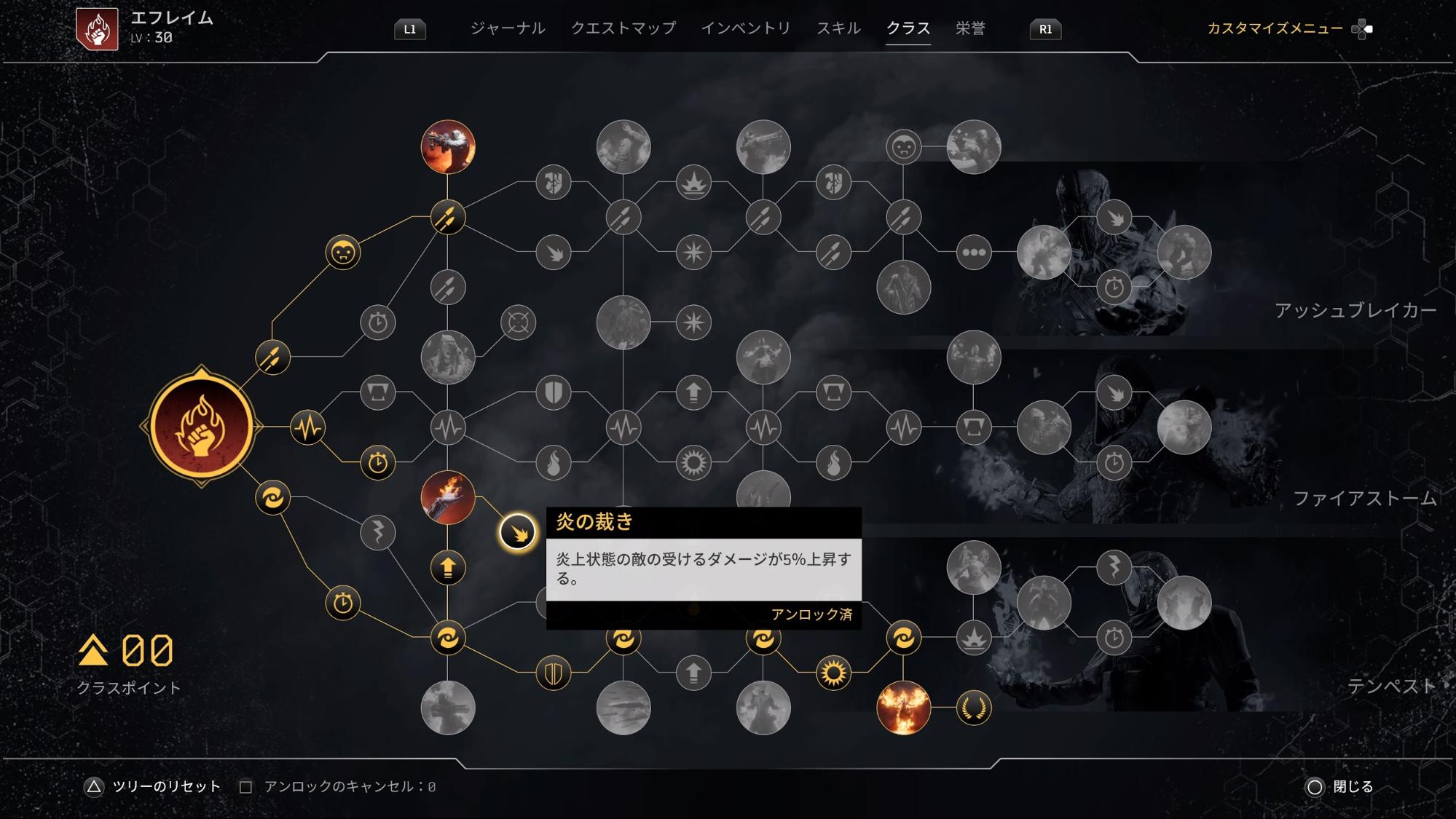 플레이어 레벨을 최대까지 올려도 거의 메워지지 않을 정도로 항목이 많은 스킬 트리. 언제든지 대가 없이 리셋이 가능하기 때문에, 마음 편하게 시행착오를 거듭할 수 있다.