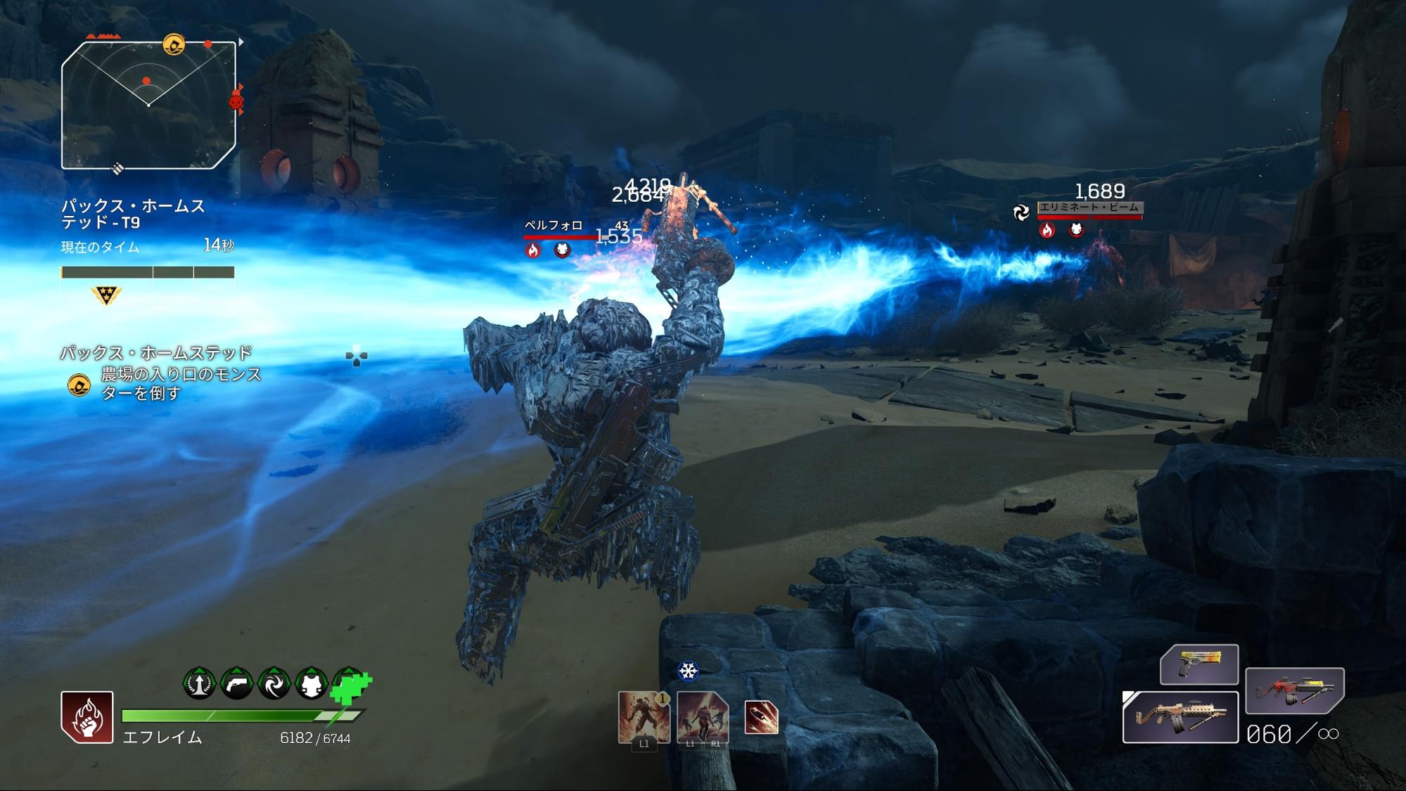엘리트 에너미 ‘크로울러’의 큰 기술 ‘엘리미네이트 빔’. 발사하는지도 잘 보이지 않을 정도의 초 원거리 공격임과 동시에, 빔을 쏘면서 각도를 바꿔 추격해오기까지 하므로 상황에 따라서는 회피가 불가능한 공격이 된다.