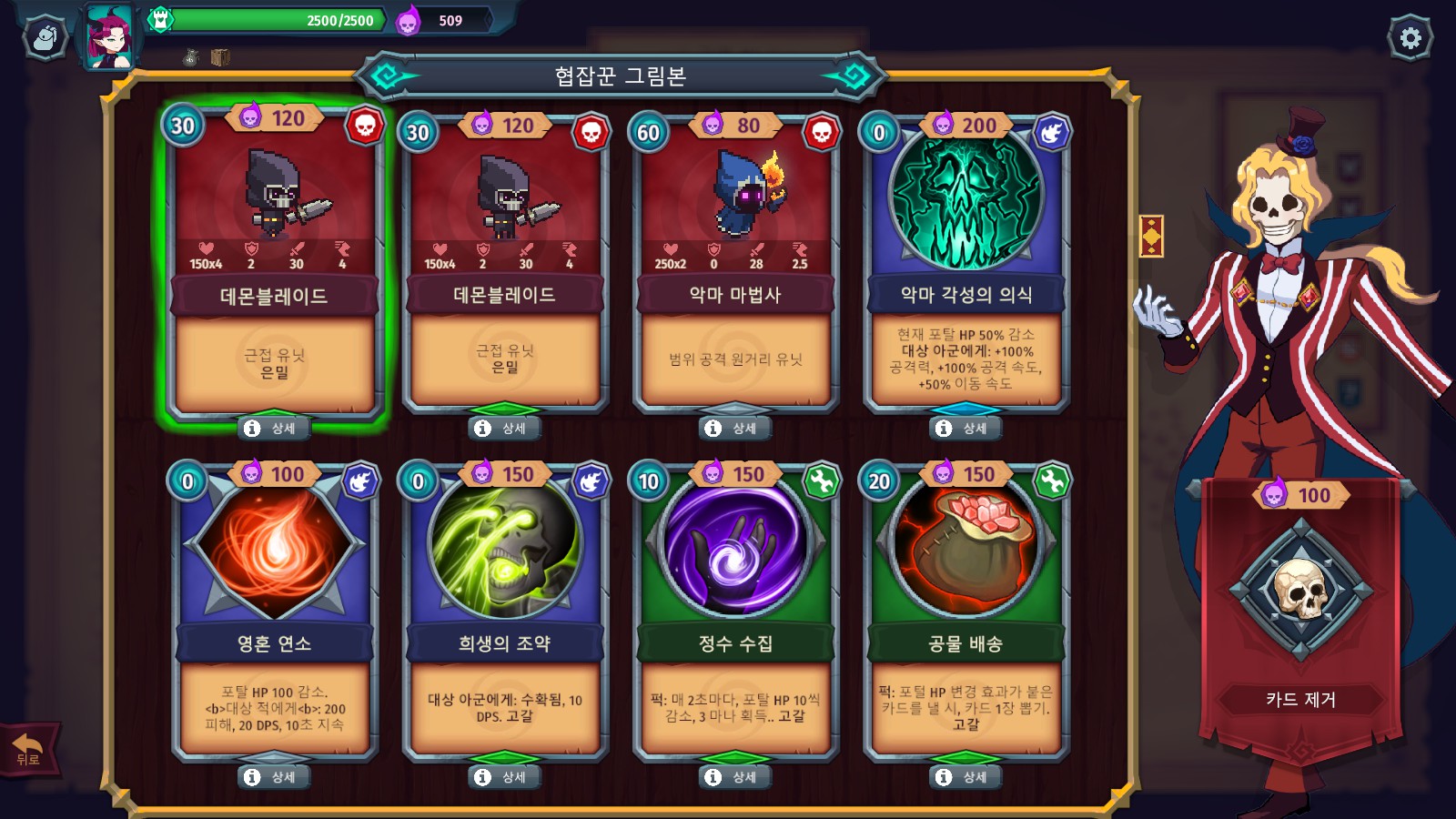 덱이나 손에 있는 카드를 강화하는 다용도 카드. 게임 내내 효과를 발휘하는 '퍽'이 붙은 능력, 손에 들 수 있는 카드의 수를 늘려주는 '초과 뽑기'가 괜찮다.
