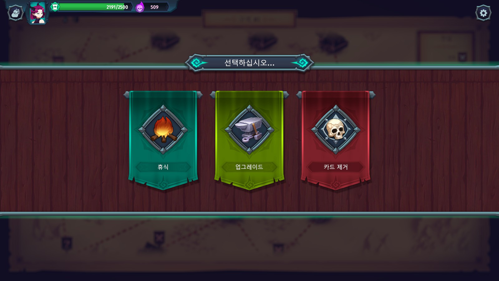 위쪽부터 휴식칸, 상점칸. 카드의 구입은 상점칸에서, 업그레이드는 휴식칸에서 할 수 있다. 카드 구입은 재화가 허락하는 한 얼마든지 가능하지만, 카드 제거는 한 번만 할 수 있다. 휴식칸에서는 카드 제거나 업그레이드, 휴식 중 하나만 할 수 있다.