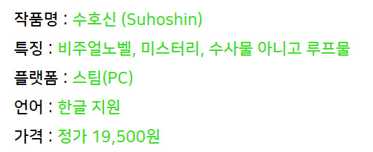 '수호신'은 지난 4월 14일 자로 스팀을 통해서 정식 출시된 조선 시대의 한 외딴 마을을 배경으로 펼쳐지는 연쇄 살인 사건을 조사하는 젊은 무관이 주인공인 '미스터리 비주얼 노벨'이다.