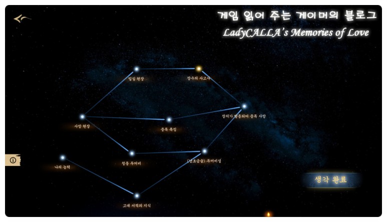 메인 스토리를 진행하면서 이전 회차에서는 선택하지 못했었던 선택지를 선택해 보거나, 해금하지 못했던 업적들을 찾아 진행하는 재미도 있어서, 엔딩 이후의 섭섭함이나 아쉬움도 이러한 수집 시스템을 채워 나가며 달랠 수 있다.