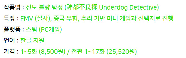 '신도 불량 탐정'은 지난 4월 28일 스팀을 통해서 출시된 FMV (영화와 같은 실사 형태의) 추리 게임으로 '사건 수사'와 '추리를 구체화시켜나가는 과정' 그리고 '선택지'와 '여러 종류의 미니 게임' 등을 통해서 진행되는 다양한 재미와 웃음 그리고 생각지도 못한 반전과 약간의 여운도 함께 안겨주는 다채로운 매력을 가지고 있는 작품이다.