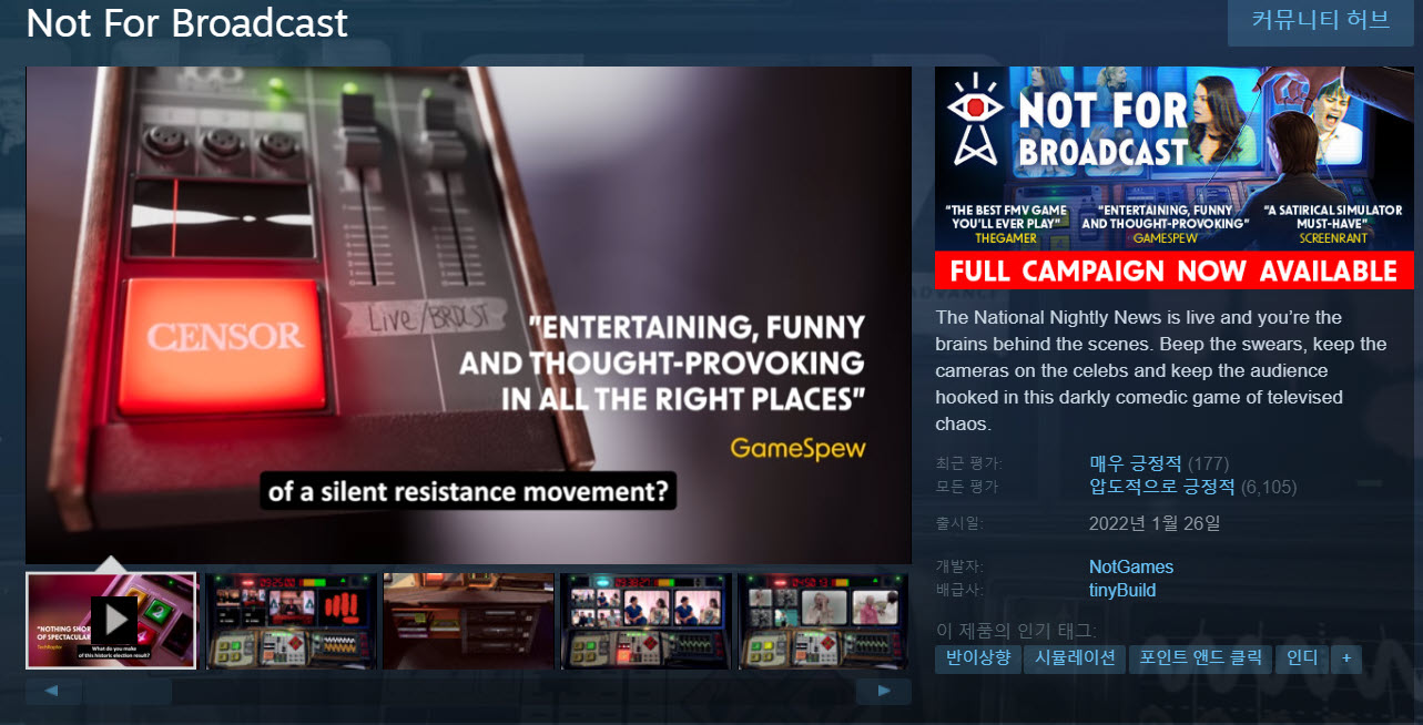 'Not For Broadcast'는 포인트 앤 클릭 스타일의 작품으로FMV로 제작된 다양한 영상들을 보면서, 작품의 제목에서 알 수 있듯 해당 영상이 방송용으로 적합한지, 부적합한지를 골라내는 것이 주 목적인 시뮬레이션 계열의 작품으로, 정가는 26,000원 입니다.