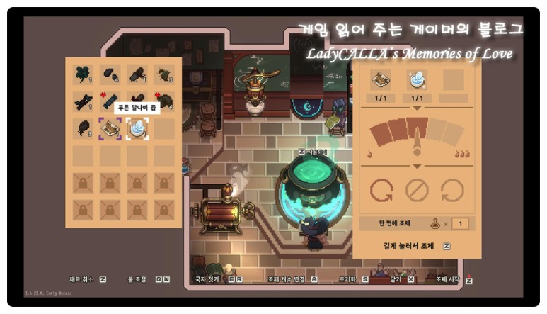 그런 다음 마녀용 가마솥으로 가서 필요한 재료들을 넣고, 불 세기를 조절하고, 젓기 방향까지 선택해 주면 물약이나 마법 사탕을 제조할 수 있다.