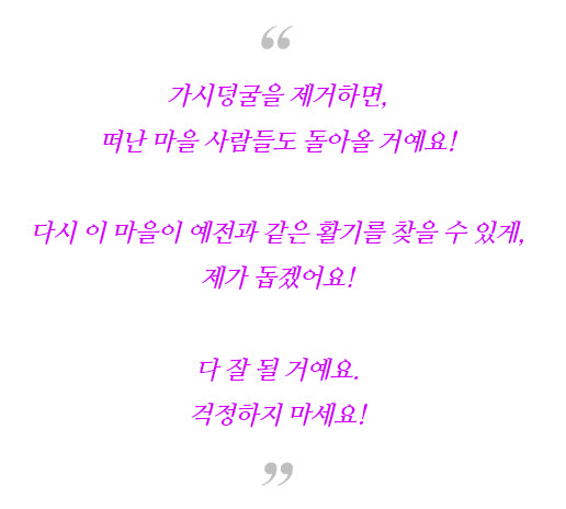 떠난 마을 사람들이 다시 마을로 돌아와 예전의 그 평온하고 평화로운 삶을 살아갈 수 있도록 마을을 천천히 천천히 조금씩 바꿔나가기 시작한다.