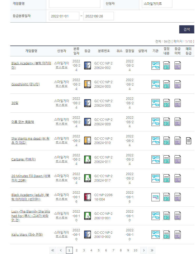 게임물 관리 위원회에서 발매된 게임을 검색해봤더니 2022년 1월 1일 부터 지금까지 스마일 게이트 스토브 에서 심의 신청을 한 게임이 94개 더군요