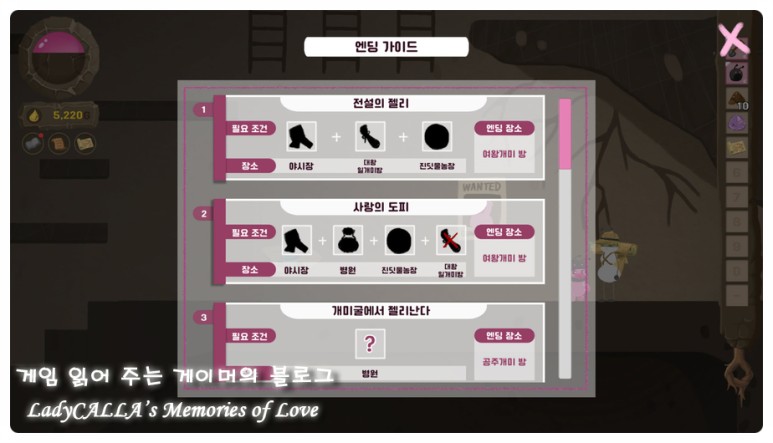 친절하게 최종 엔딩 12개에 대해서는 어느 장소에서 엔딩을 볼 수 있고 어떤 아이템들이 필요한지에 대한 힌트가 담겨 있는 '엔딩 가이드'까지 게임 내에서 제공해 주고 있기 때문에,