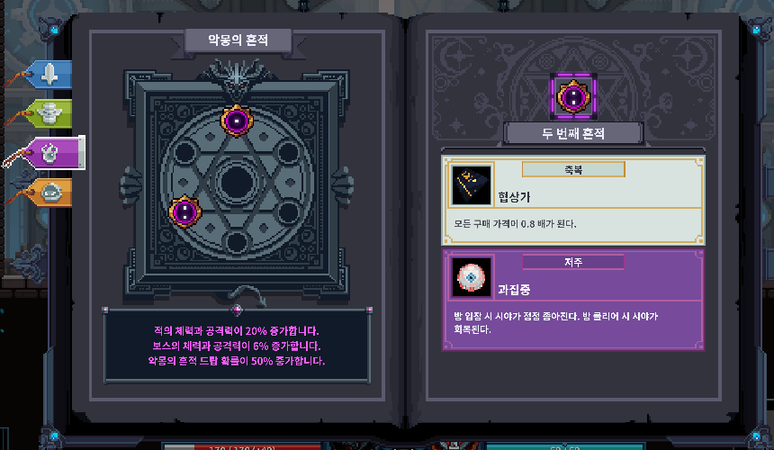 악몽의 흔적은 하이리스크 - 하이리턴 아이템으로 플레이어에게 획득할지 말지 고민하게 하는 요소로 작동시키고자 했습니다. 그런데 지금은 잘 모르겠군요... 잘 작동하지 않는다고 생각되지만 다양한 의견이 필요합니다. 일단은 좀 더 리스크와 리턴이 큰 방향으로 개선할 예정입니다. 현재 악몽의 흔적 시스템에 대한 피드백 부탁드립니다!