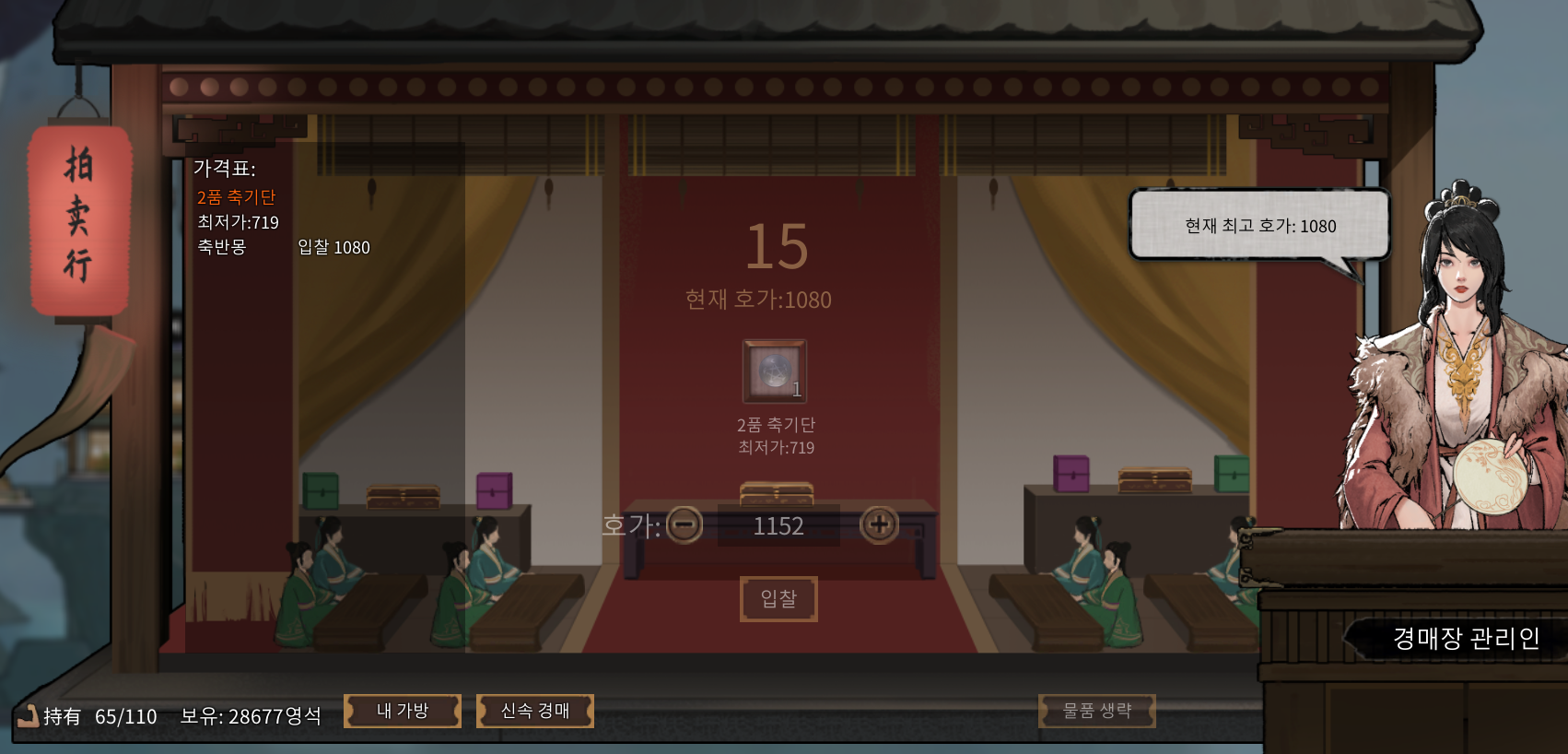 검색해보니 저 말고도 이 버그 걸리신 분 계시던데 호봉주 경매장에서 2품 축기단 경매 도중 시간이 지나거나 물품 생략하면 먹통이 되고