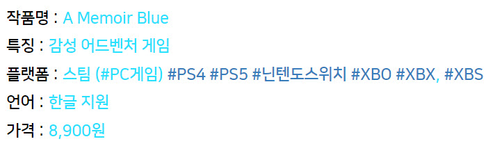 한 달간의 X-BOX 게임 패스 기간이 끝나기 전 마지막으로 알차게 즐긴 작품인 '메모아 블루'는 대략 1시간 30분 정도의 짧은 플레이 타임을 가지고 있는 감성 중심의 내러티브 어드벤처 게임이다.