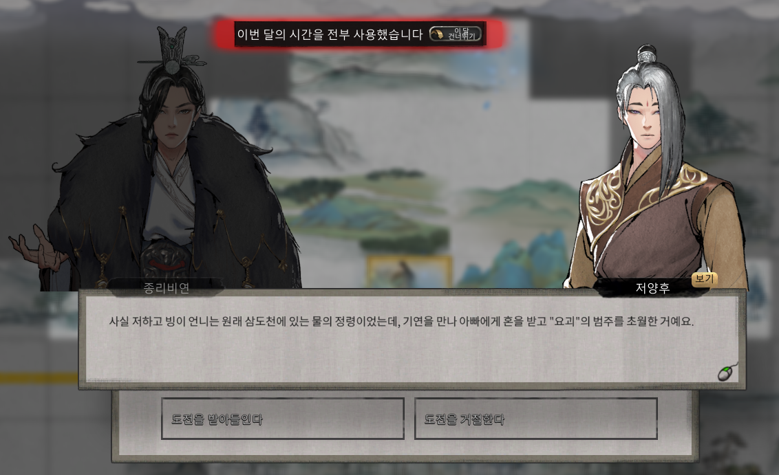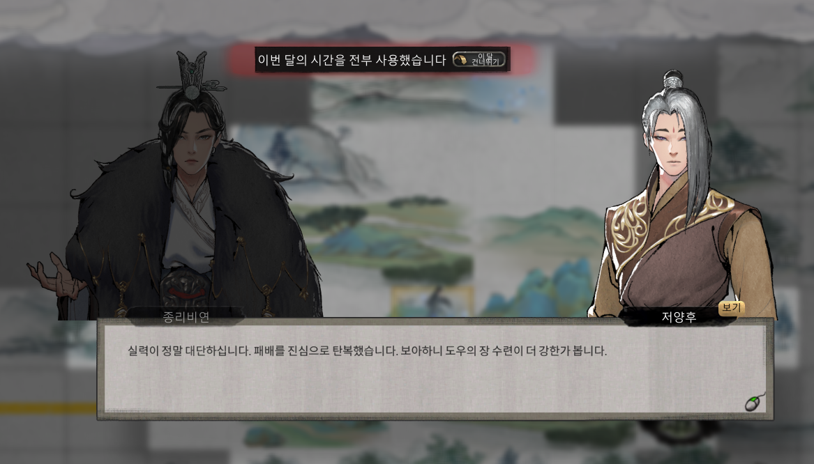 스샷 1은 비무 전 상대방의 마지막 대사, 스샷 2,3은 비무 끝난 직후 제 대사와 상대방 대사 순입니다