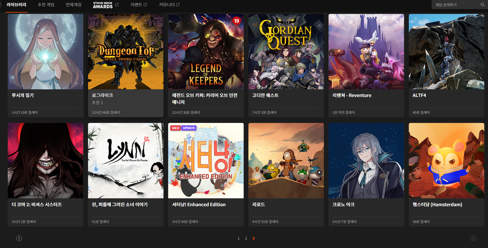 스토브는 한 페이지당 30개의 게임이 기록되니까 3페이지를 채웠으니 구매한 게임이 90개 네요