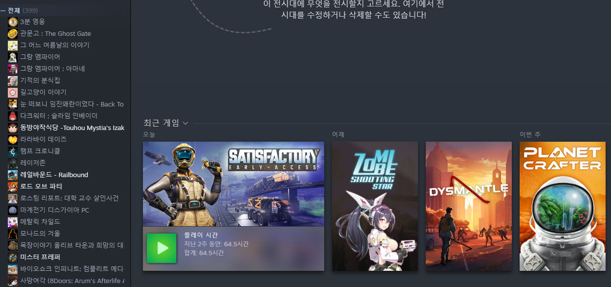 스팀 게임은 399개 이고 구매 게임의 상당수가 B급과 인디 게임입니다.