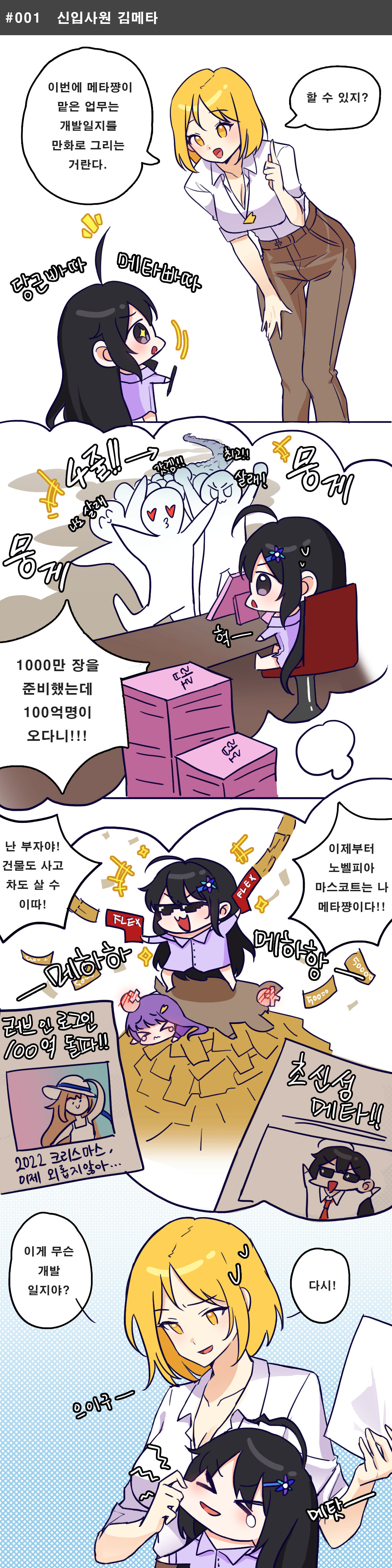 └야근하다 정신줄 놓은 막내, 김메타 양의 ‘자아실현’ 4컷 만화입니다.