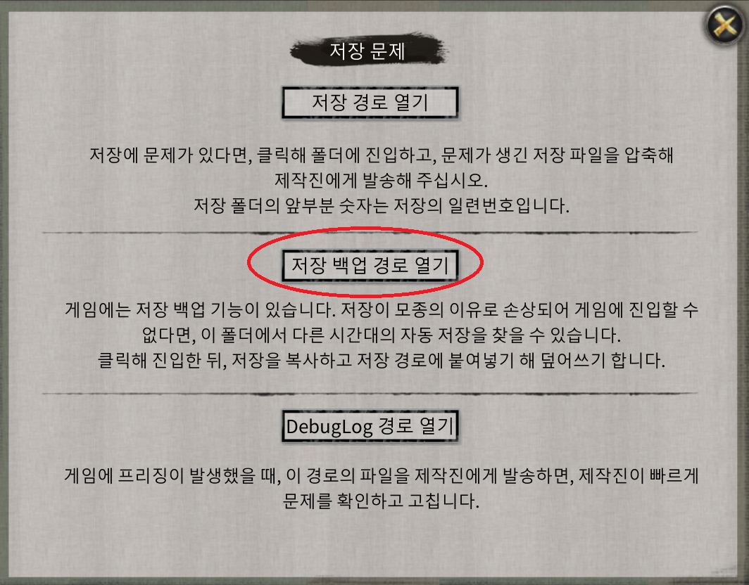 '저장 백업 경로 열기'가 작동하지 않습니다.
