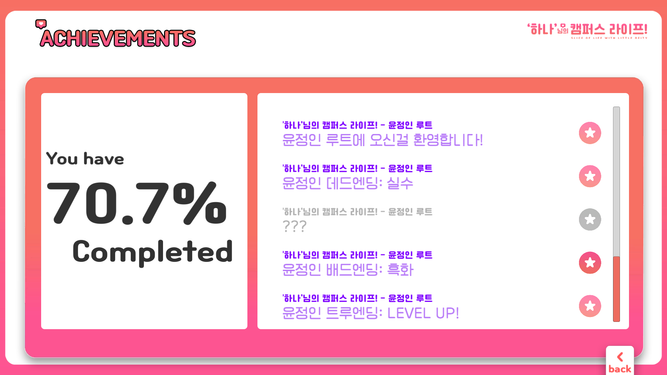 뭐가 꼬인건지 엔딩 세부조건이 살짝 달랐던건지 배드엔딩1에 해당하는 흑화 엔딩이 나왔고, 하필 achievements에 순서도 베드엔딩2가 위에 있고 배드엔딩1(흑화)이 아래에 있어서 흑화 엔딩이 배드엔딩2인줄 착각하고 있었네요