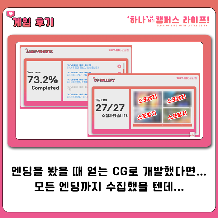 근데 그것을 활용하는 엔딩에 CG가 들어가 있지 않아서 모든 엔딩을 보지 않고, CG를 전부 모을 수 있는 기획적인 부분이 아쉬웠다.로 평가를 남기고 싶습니다.