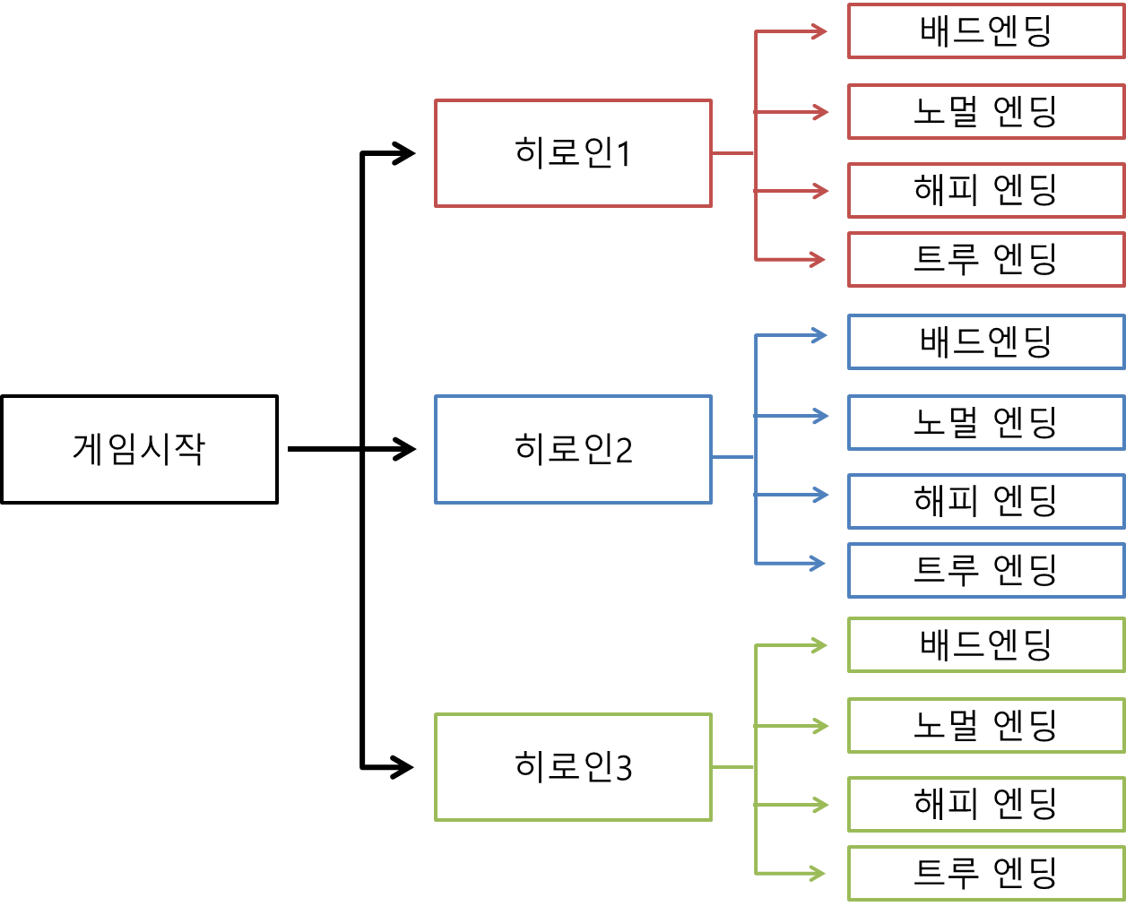 경우의 수를 한 번씩 다 경험해봐야 모든 엔딩을 수집할 수 있기 때문에 정석적인 방식으로 개발했다고 생각합니다.
