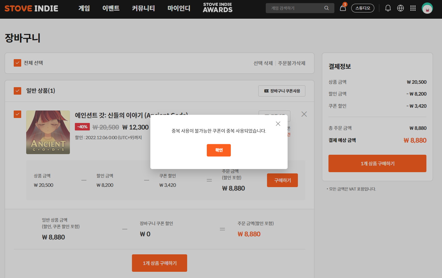 쿠폰 A,B둘다 한게임에 적용할라고 하면, 두개다 선택은 되는데 결제할라고 누르면