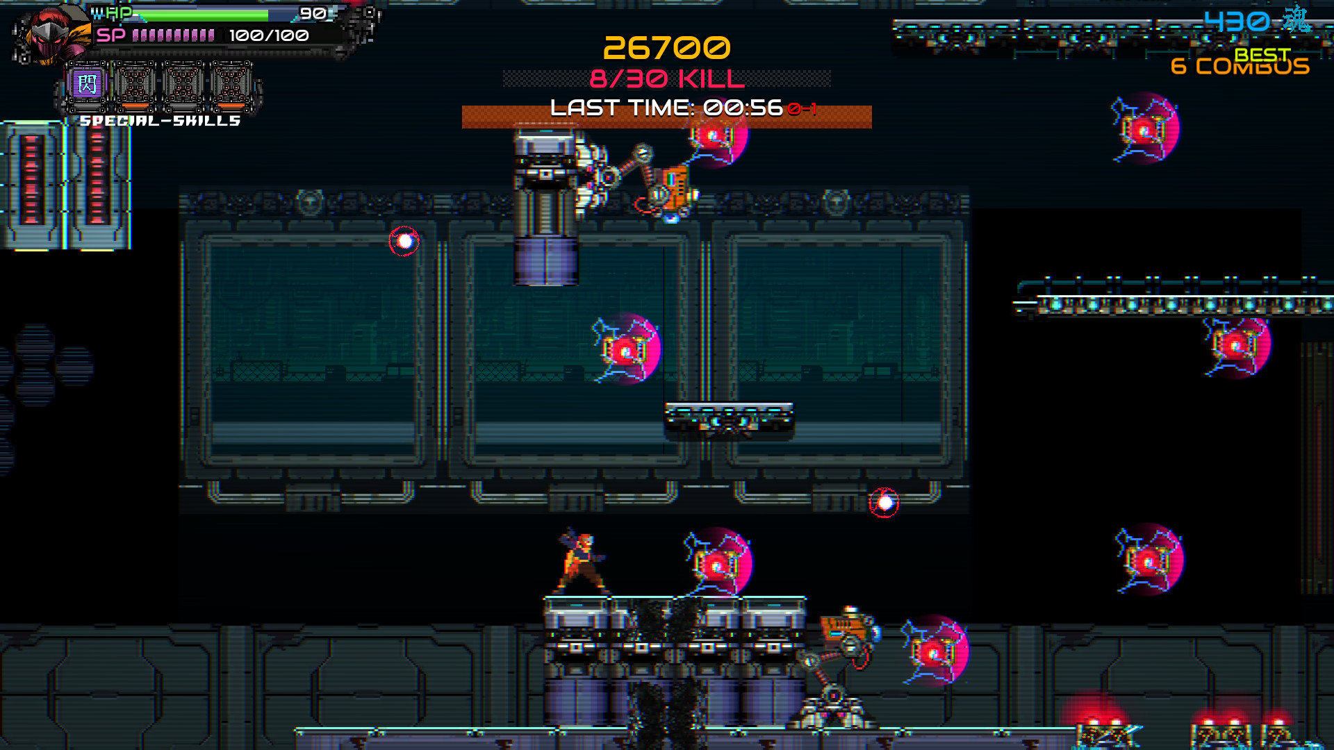 그리고 비행형 적들 같은 경우 계속 움직이면서 수리검을 날리면서 방해 합니다. 하지만 이들을 없애려 해도 공중 근접 공격은 1회 공격을 하면 그대로 내려오고, 수리검은 높이를 맞춰야 하다 보니 비행형 적들은 상대하기도 힘듭니다.