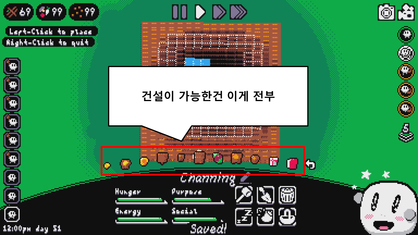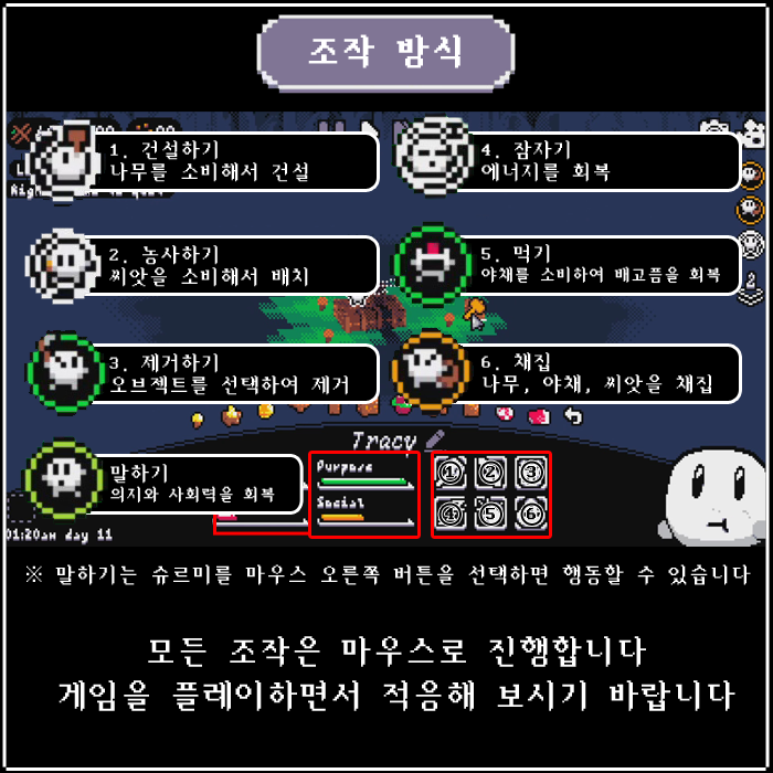 가만히 있으면 배고픔과 에너지가 감소하기 때문에 잠자기 아이콘을 클릭하여 에너지를 회복시키거나 먹기 아이콘을 클릭하여 배고픔을 해결해야합니다.