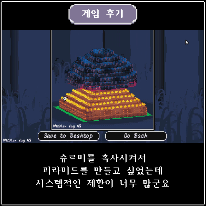 이렇게 채집 -> 슈르미 관리 -> 채집 ... 의 무한 반복 순으로 게임의 사이클이 돌아갑니다.