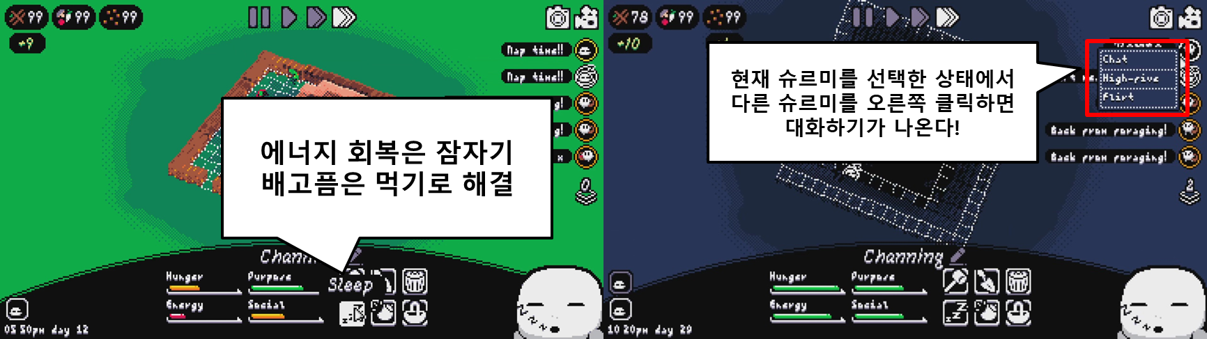 또한 의지와 사회력이 떨어질 때도 있는데 이 부분은 슈르미끼리 대화를 통해서 해결할 수 있습니다.