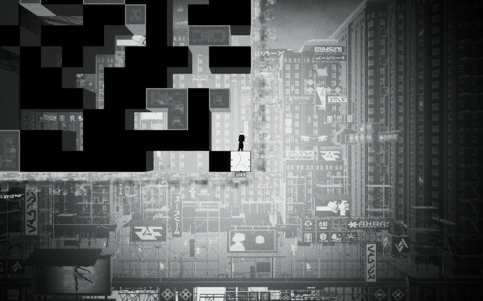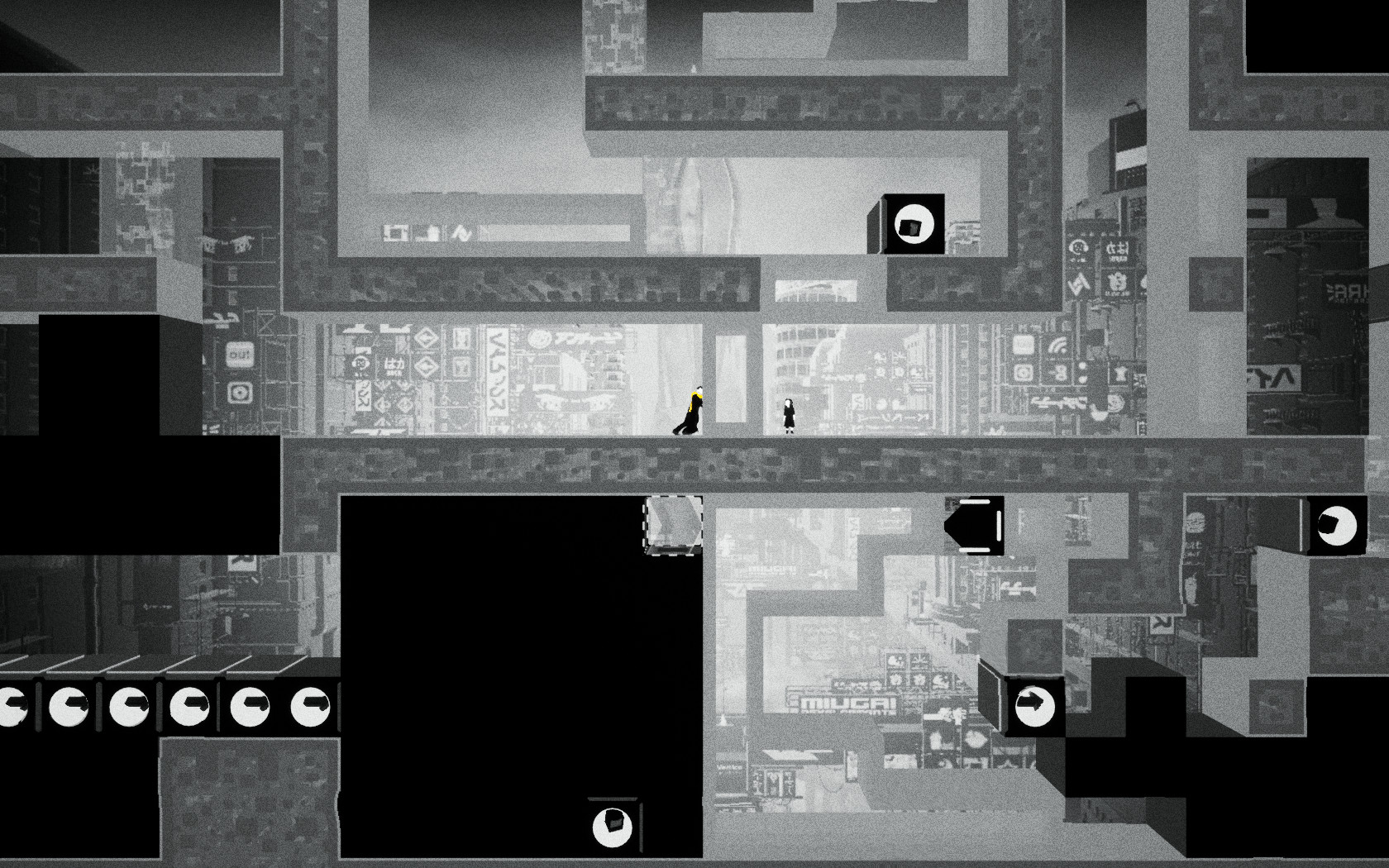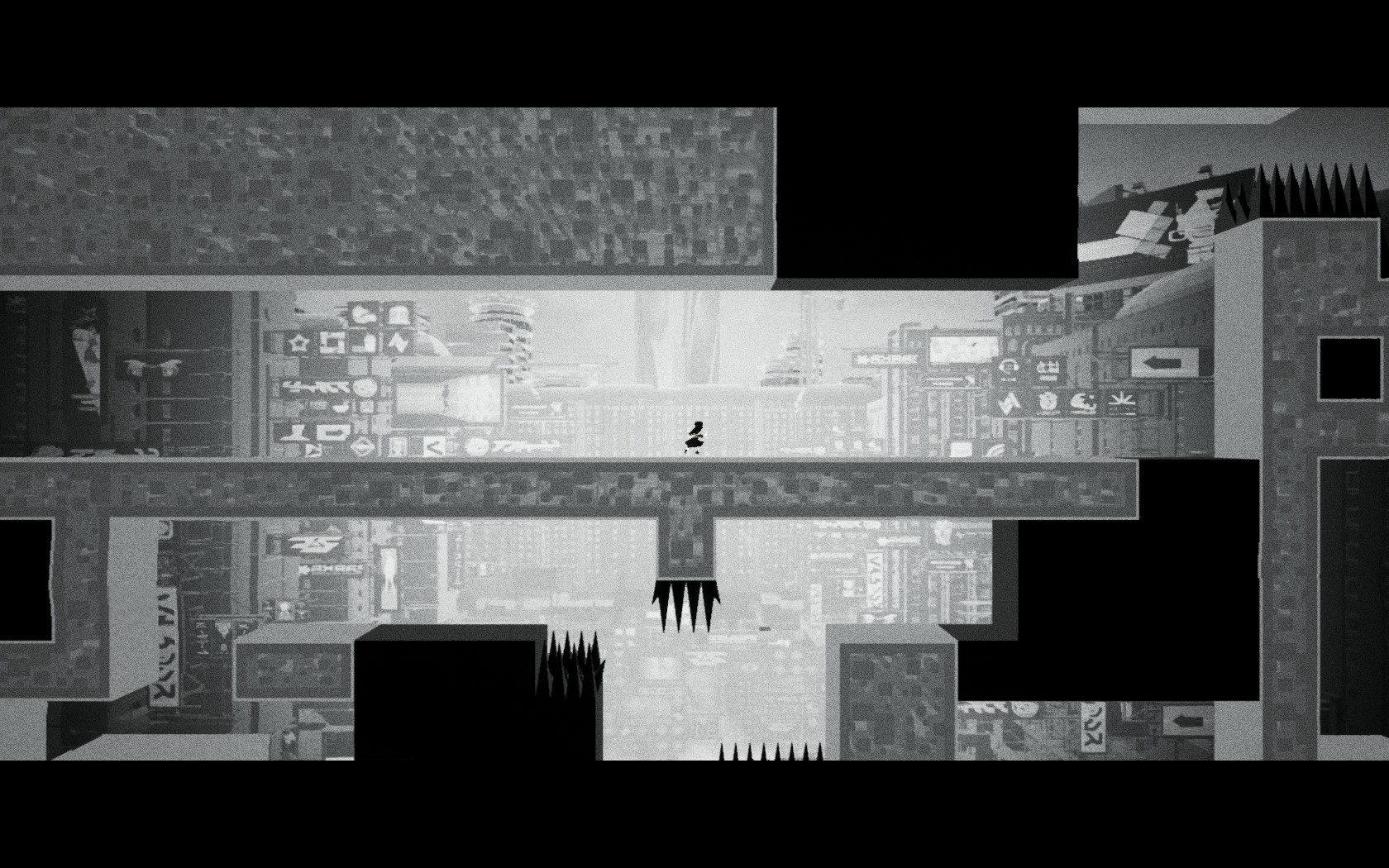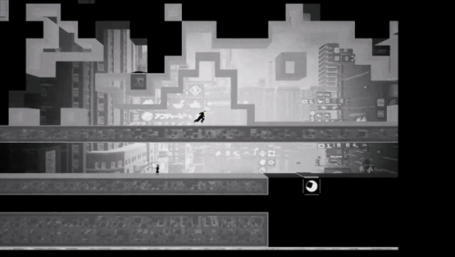 게임 화면이 흑과 백 그리고 회색으로 이뤄지고 있는데 주인공은 특수 능력 시프트로 흑과 백을 오고갈 수 있습니다. 흑과 백이 오고 갈 때마다 화면이 뒤집히고, 흑은 길이 되고 흑일 때의 빈자리는 백이 되서 장애물이 됩니다.
